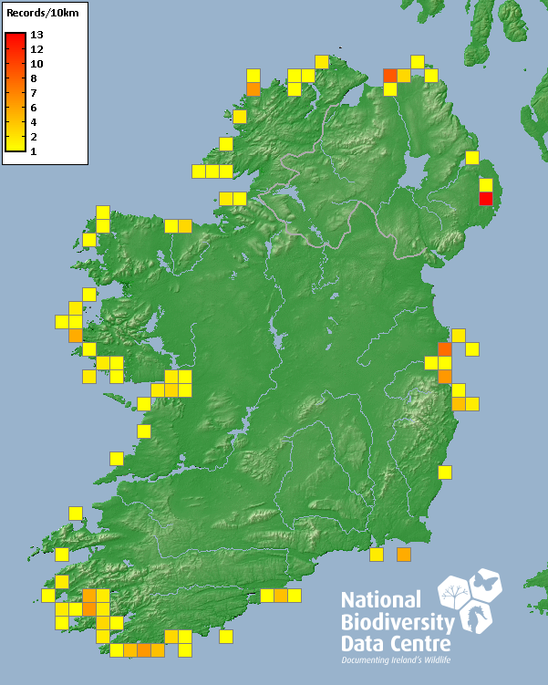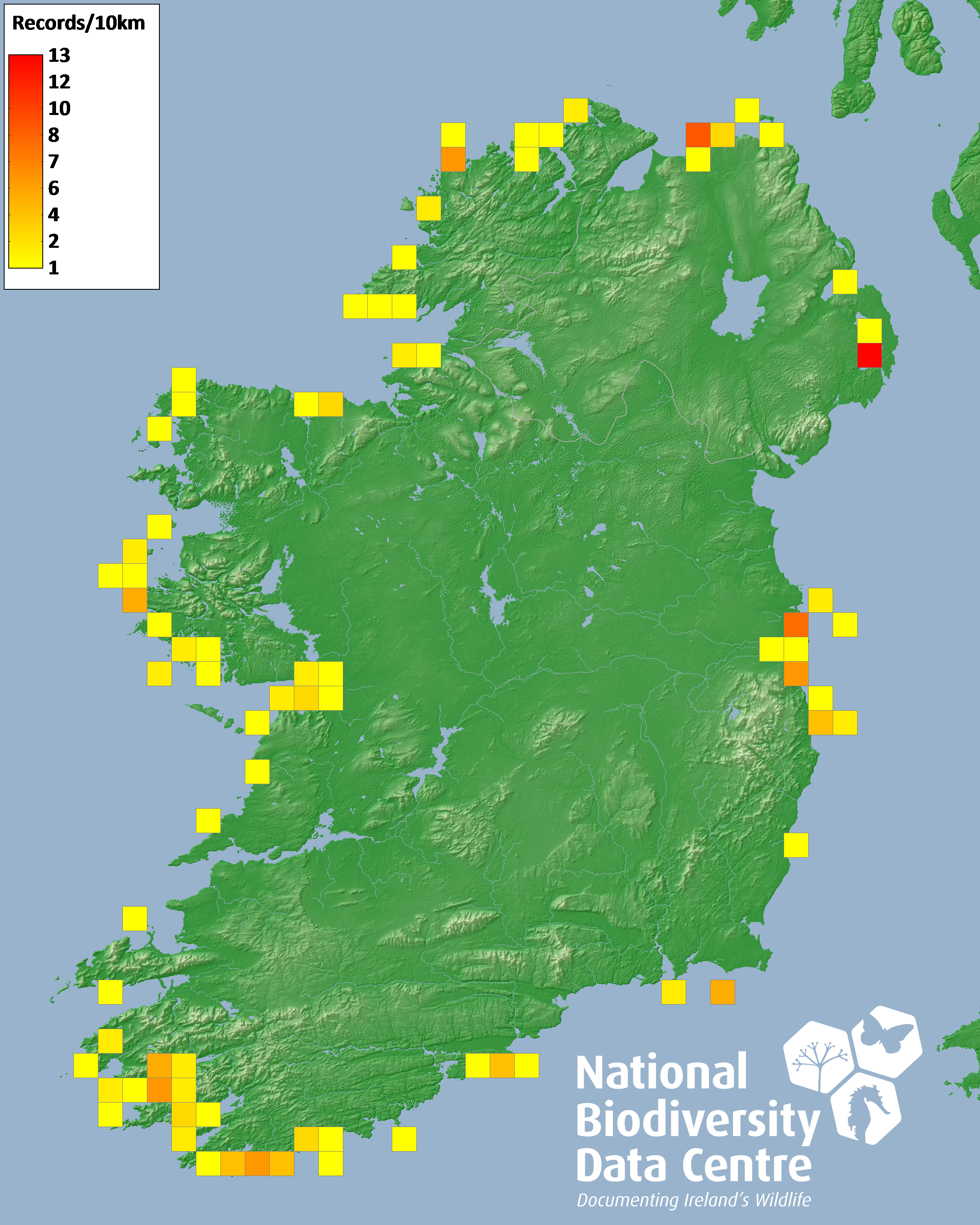 Distribution of the number of records recorded within each 10km grid square (ITM).Marine Map - 50km