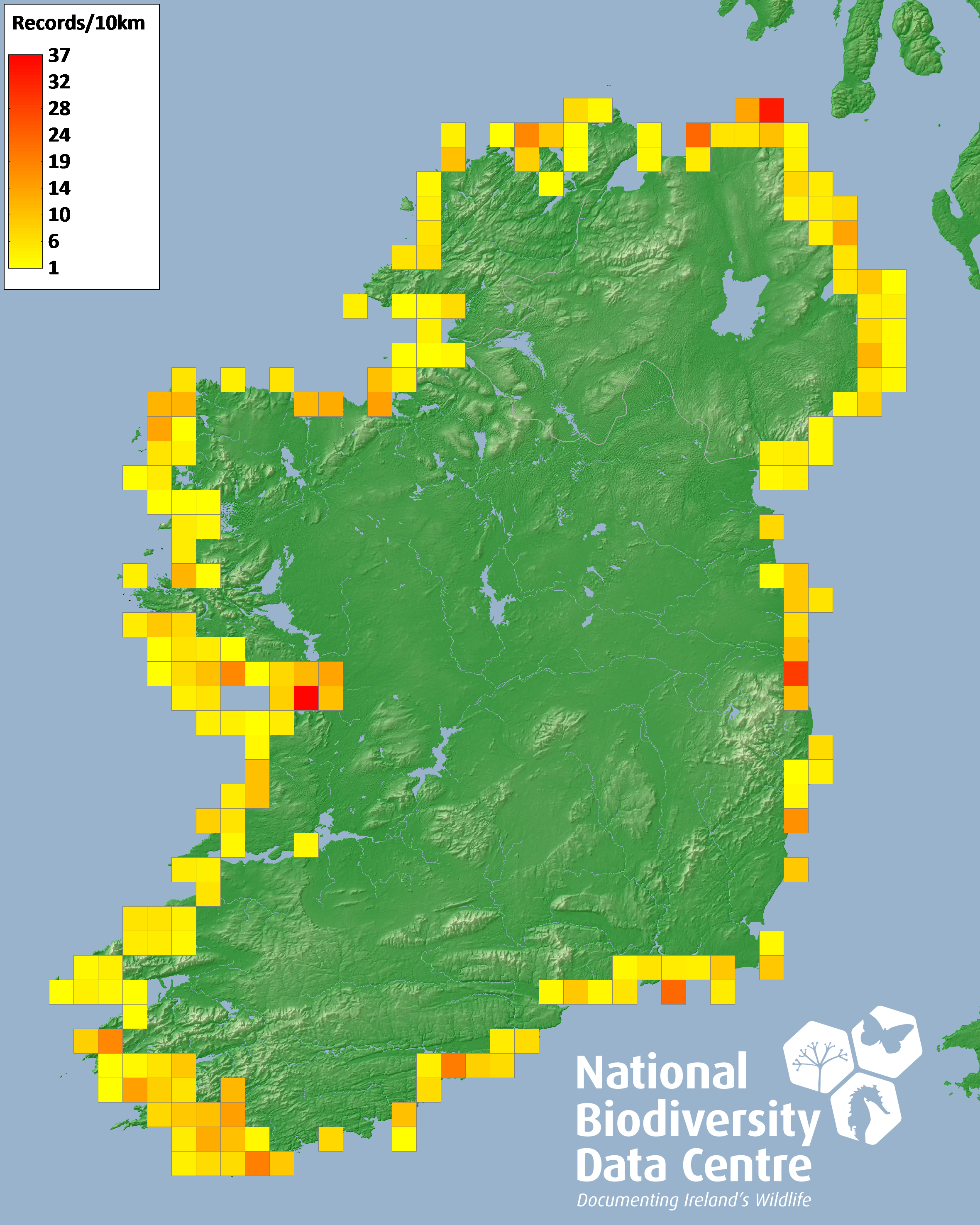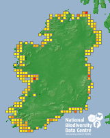 Distribution of the number of records recorded within each 10km grid square (ITM).Marine Map - 50km