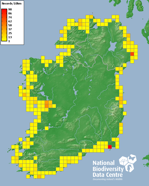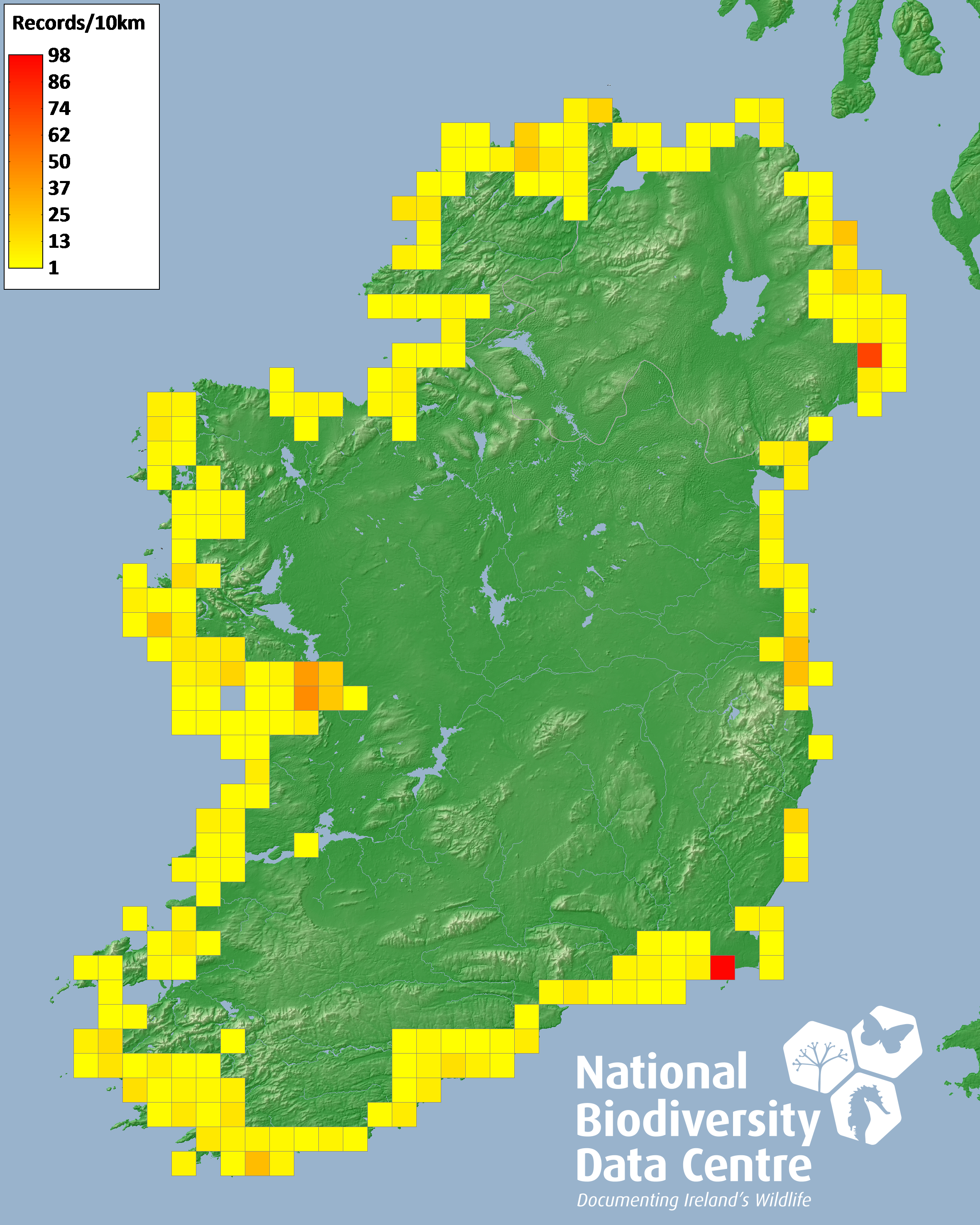Distribution of the number of records recorded within each 10km grid square (ITM).Marine Map - 50km