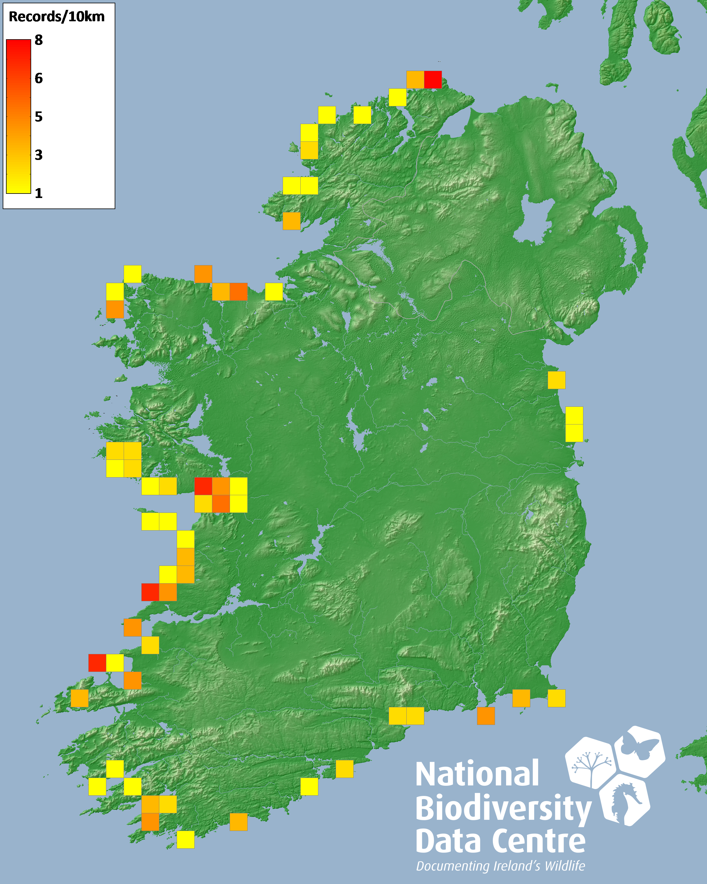 Distribution of the number of records recorded within each 10km grid square (ITM).Marine Map - 50km