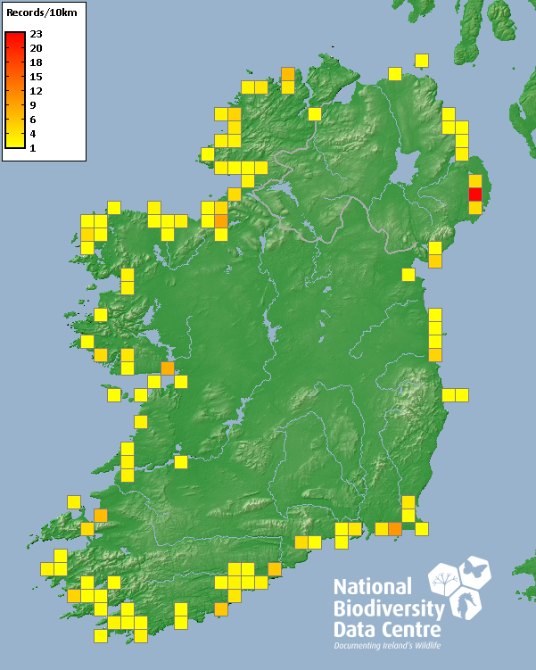 Distribution of the number of records recorded within each 10km grid square (ITM).Marine Map - 50km