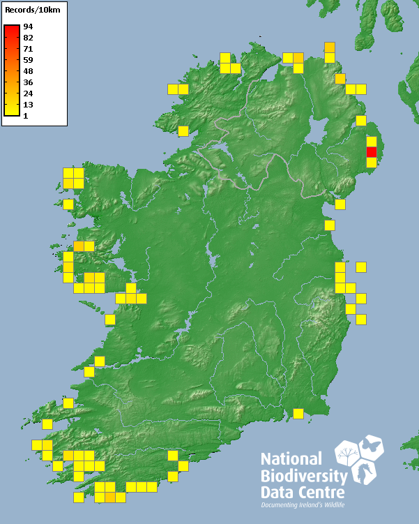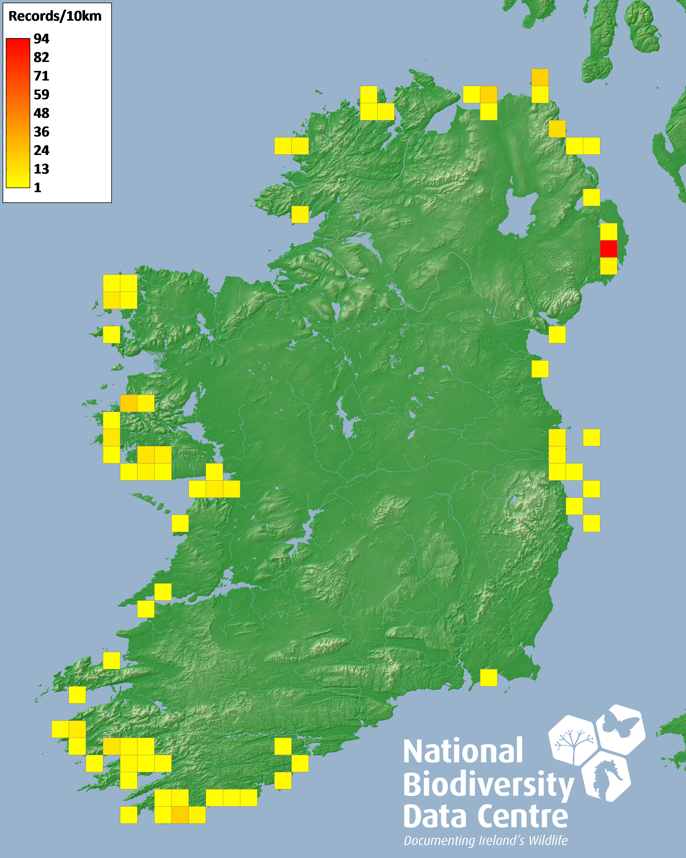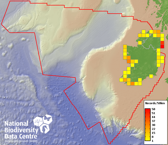 Distribution of the number of records recorded within each 10km grid square (ITM).Marine Map - 50km