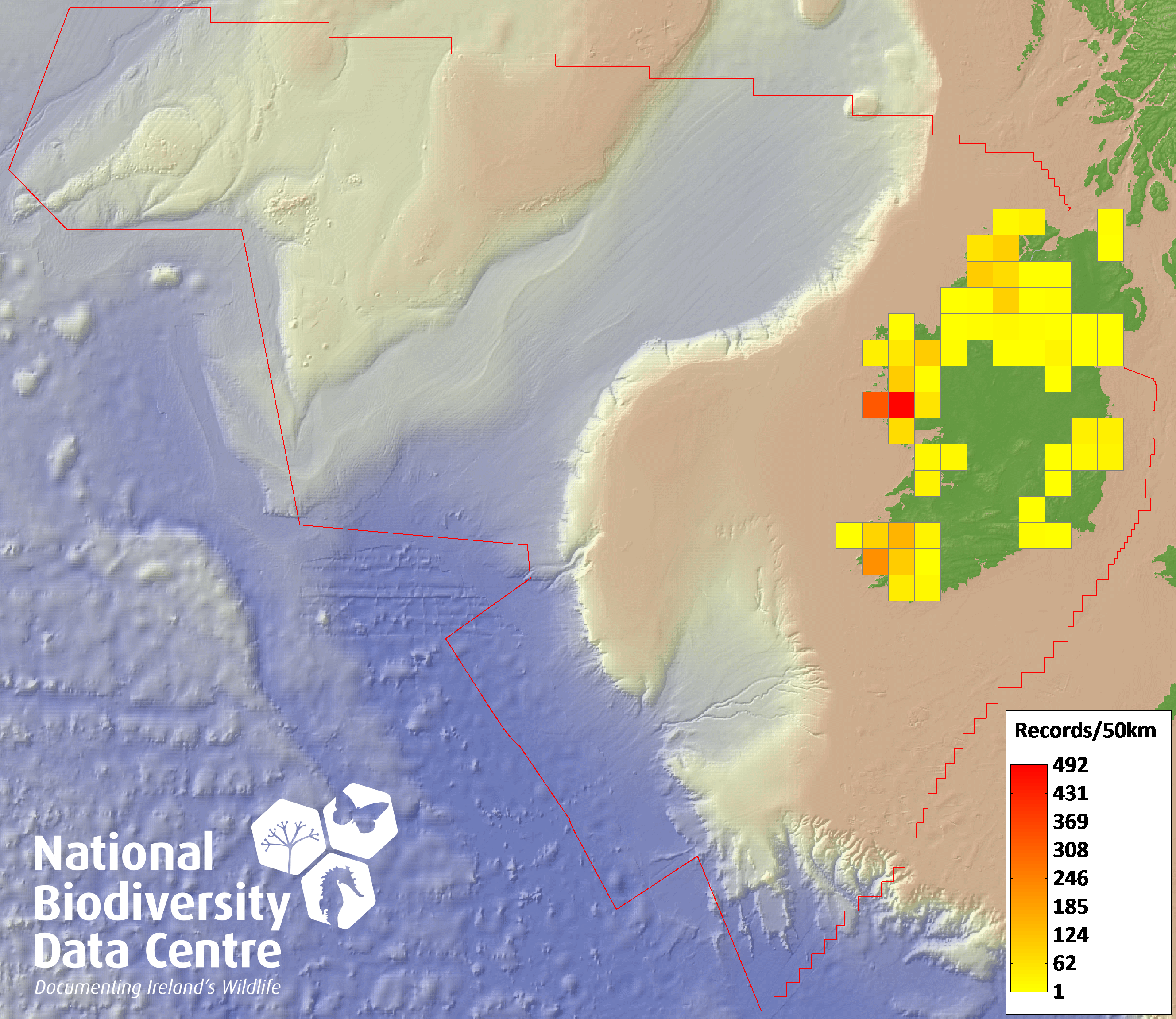 Distribution of the number of records recorded within each 10km grid square (ITM).Marine Map - 50km