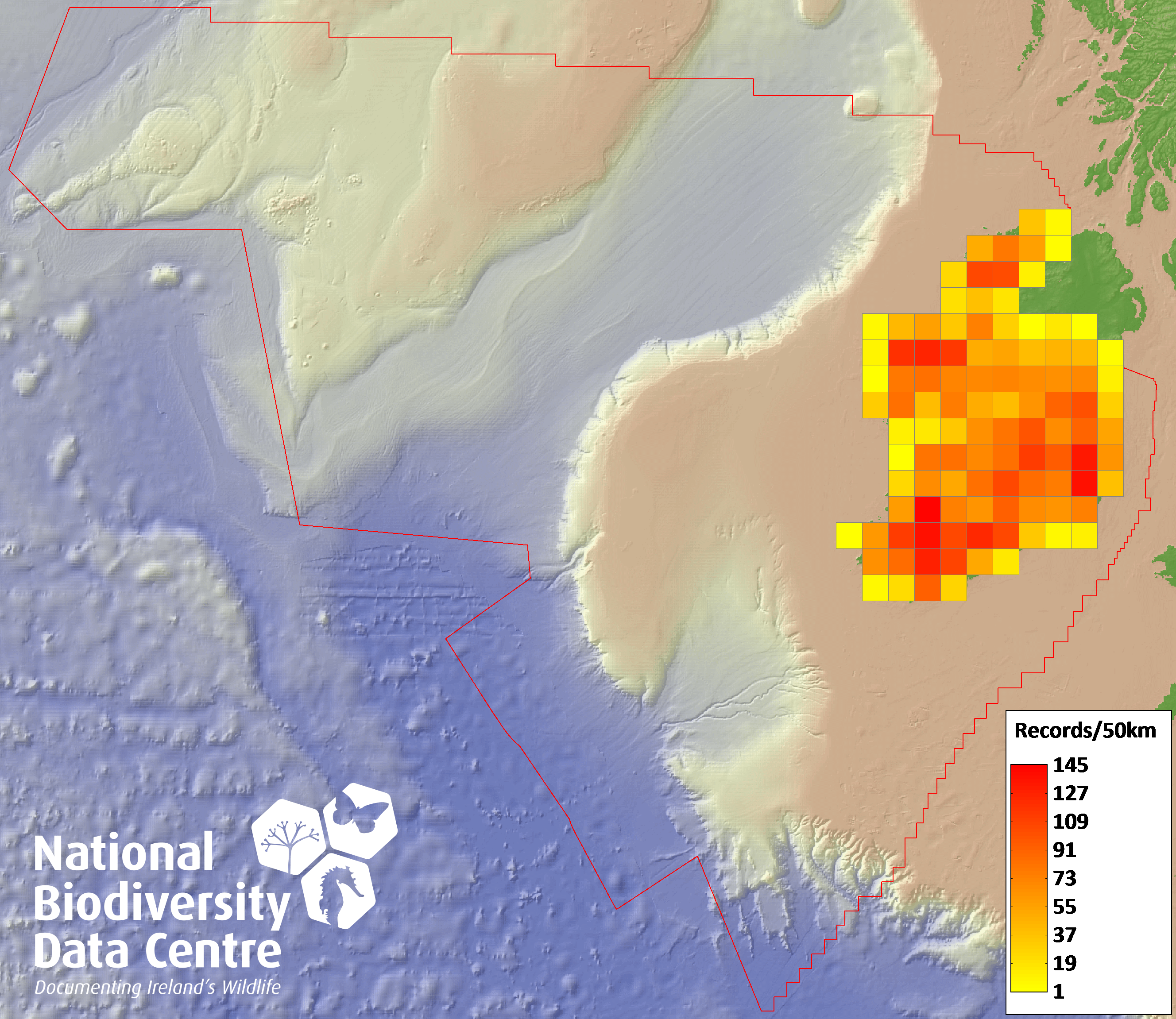 Distribution of the number of records recorded within each 10km grid square (ITM).Marine Map - 50km