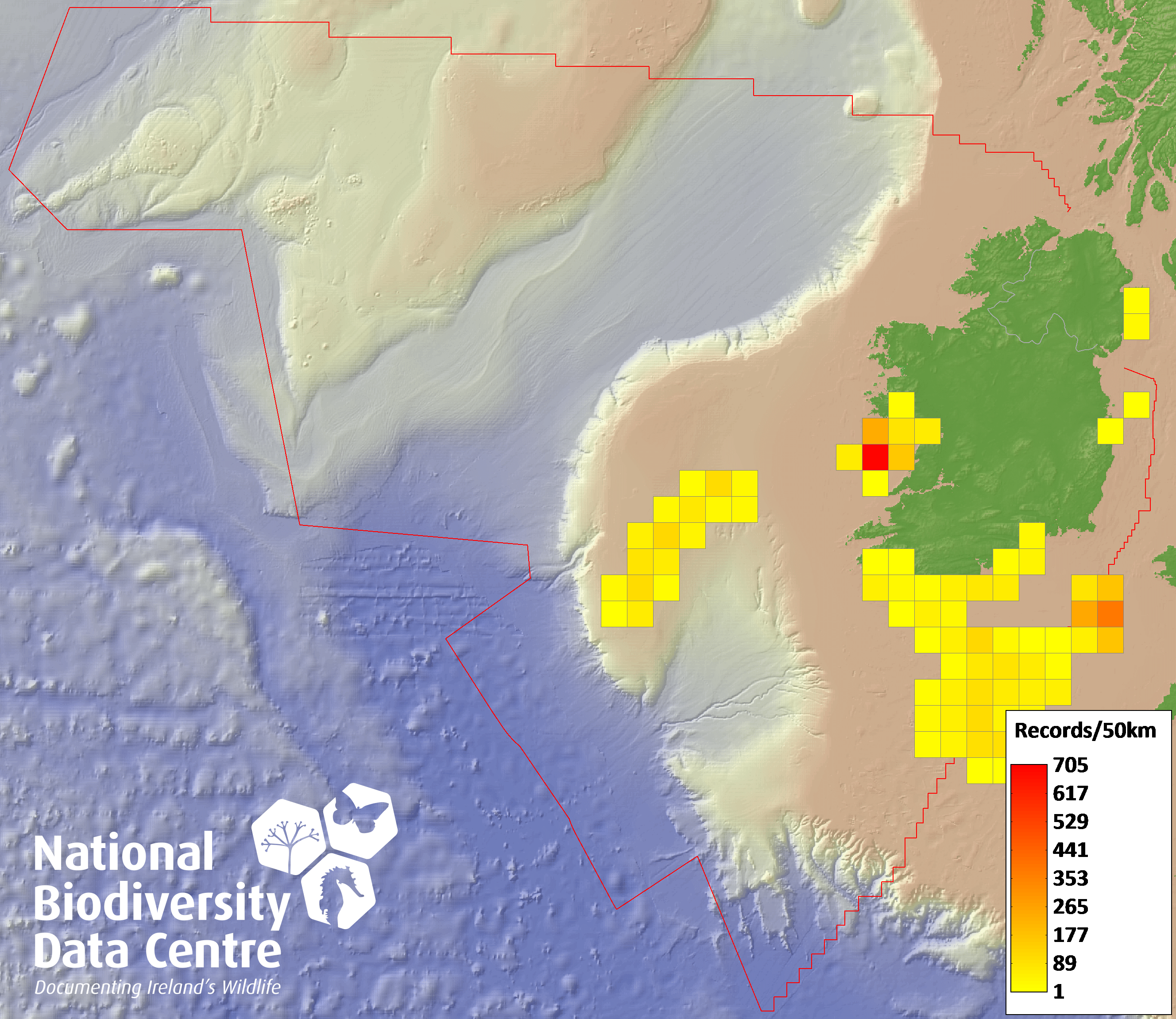 Distribution of the number of records recorded within each 10km grid square (ITM).Marine Map - 50km