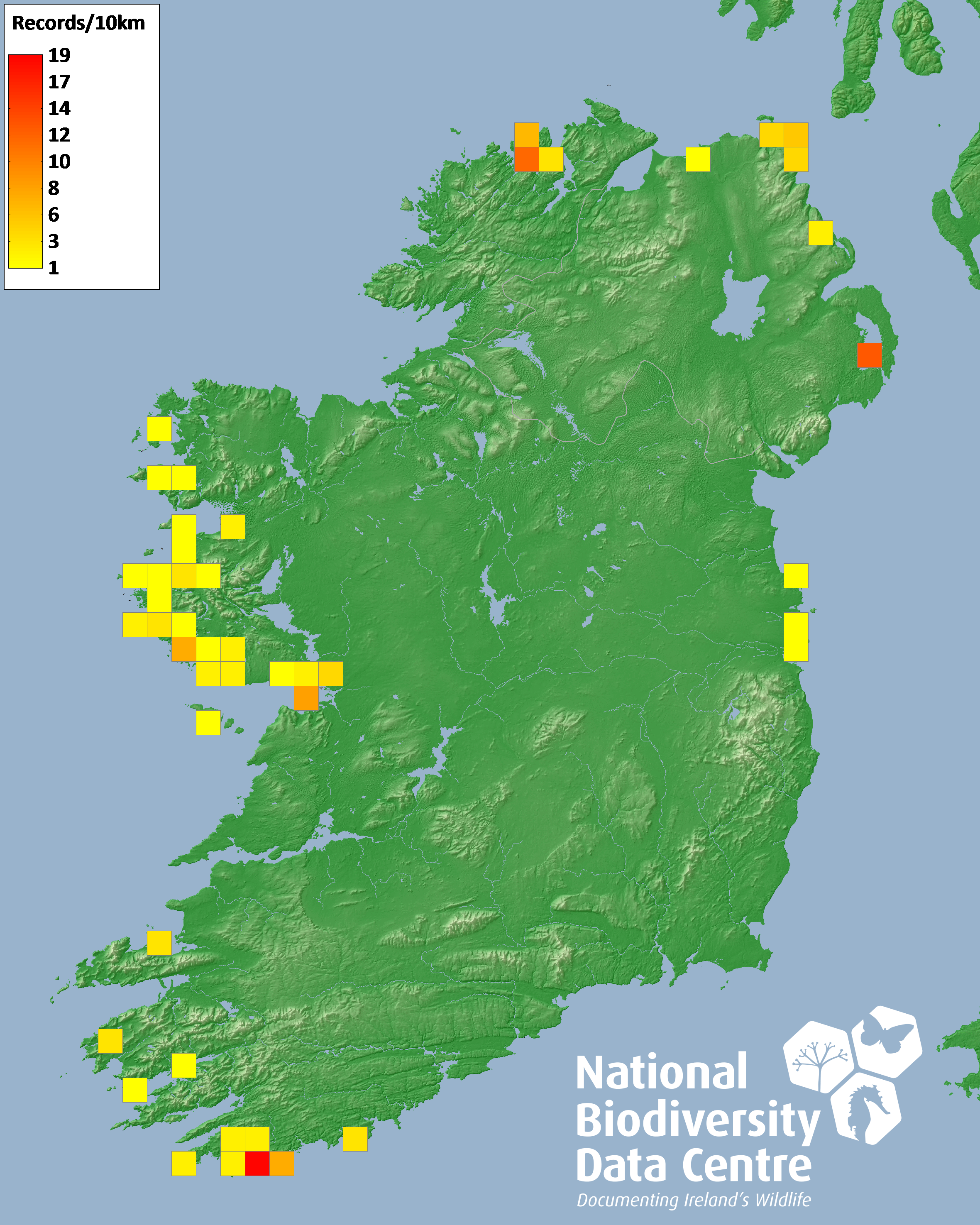 Distribution of the number of records recorded within each 10km grid square (ITM).Marine Map - 50km