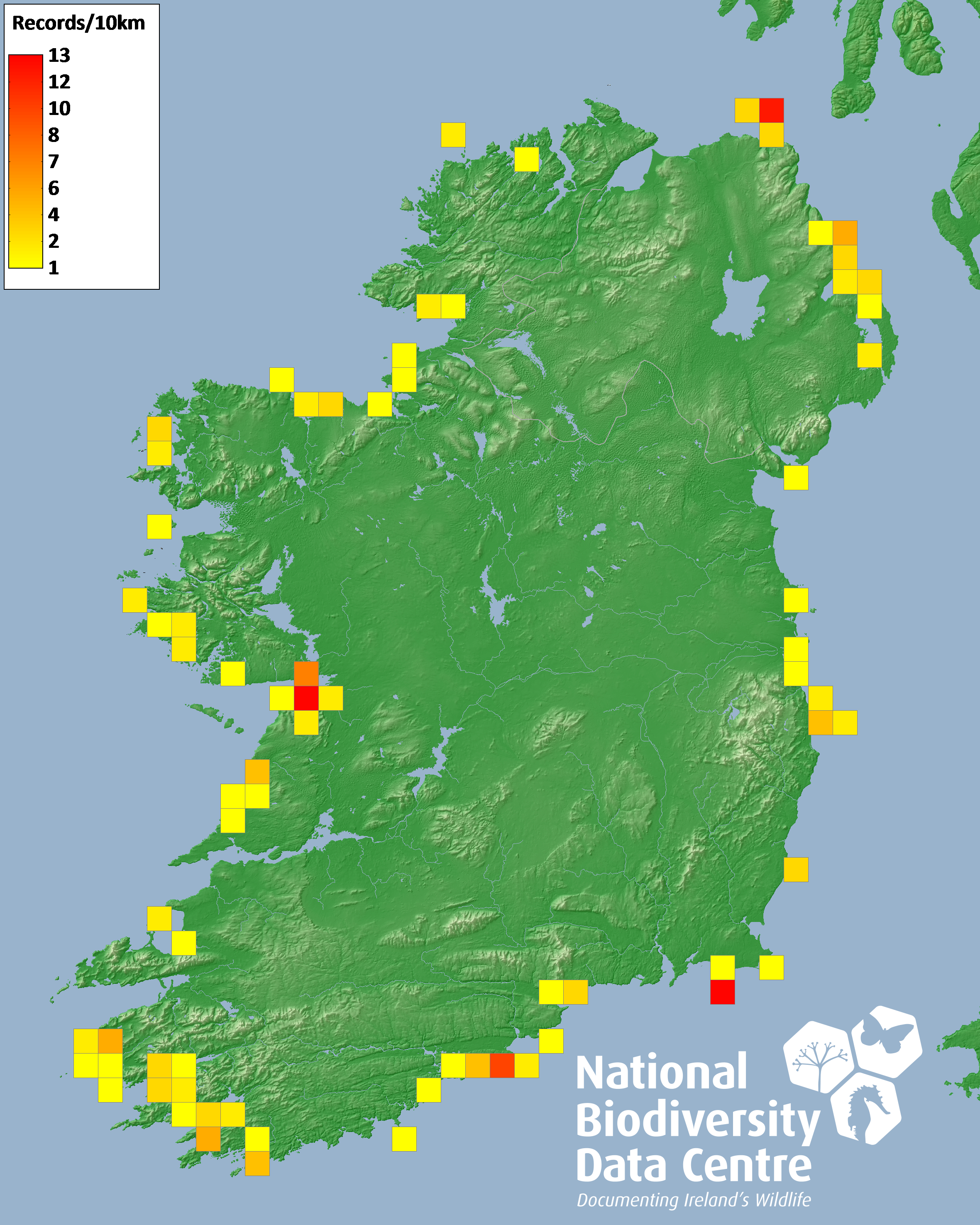 Distribution of the number of records recorded within each 10km grid square (ITM).Marine Map - 50km