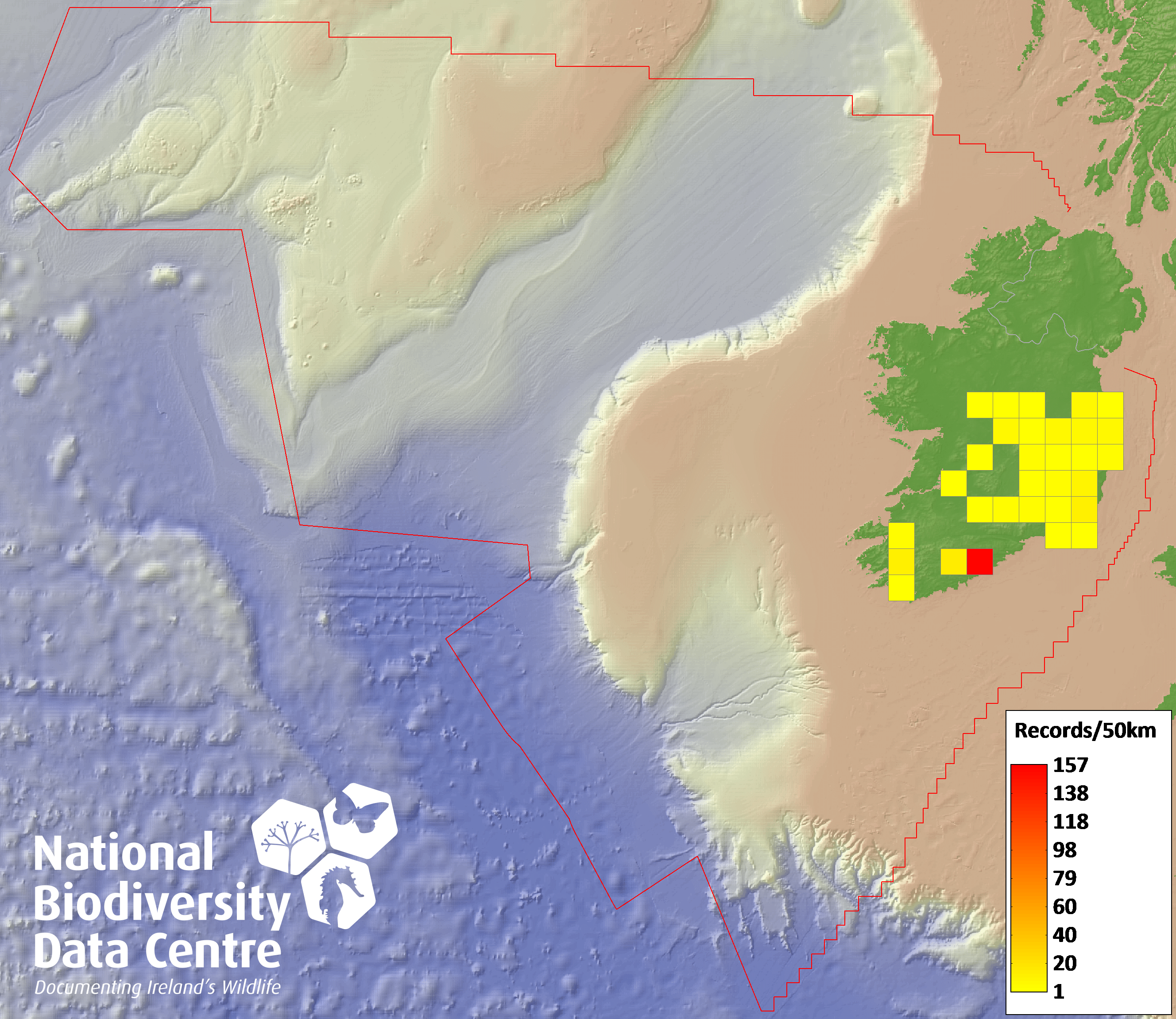 Distribution of the number of records recorded within each 10km grid square (ITM).Marine Map - 50km