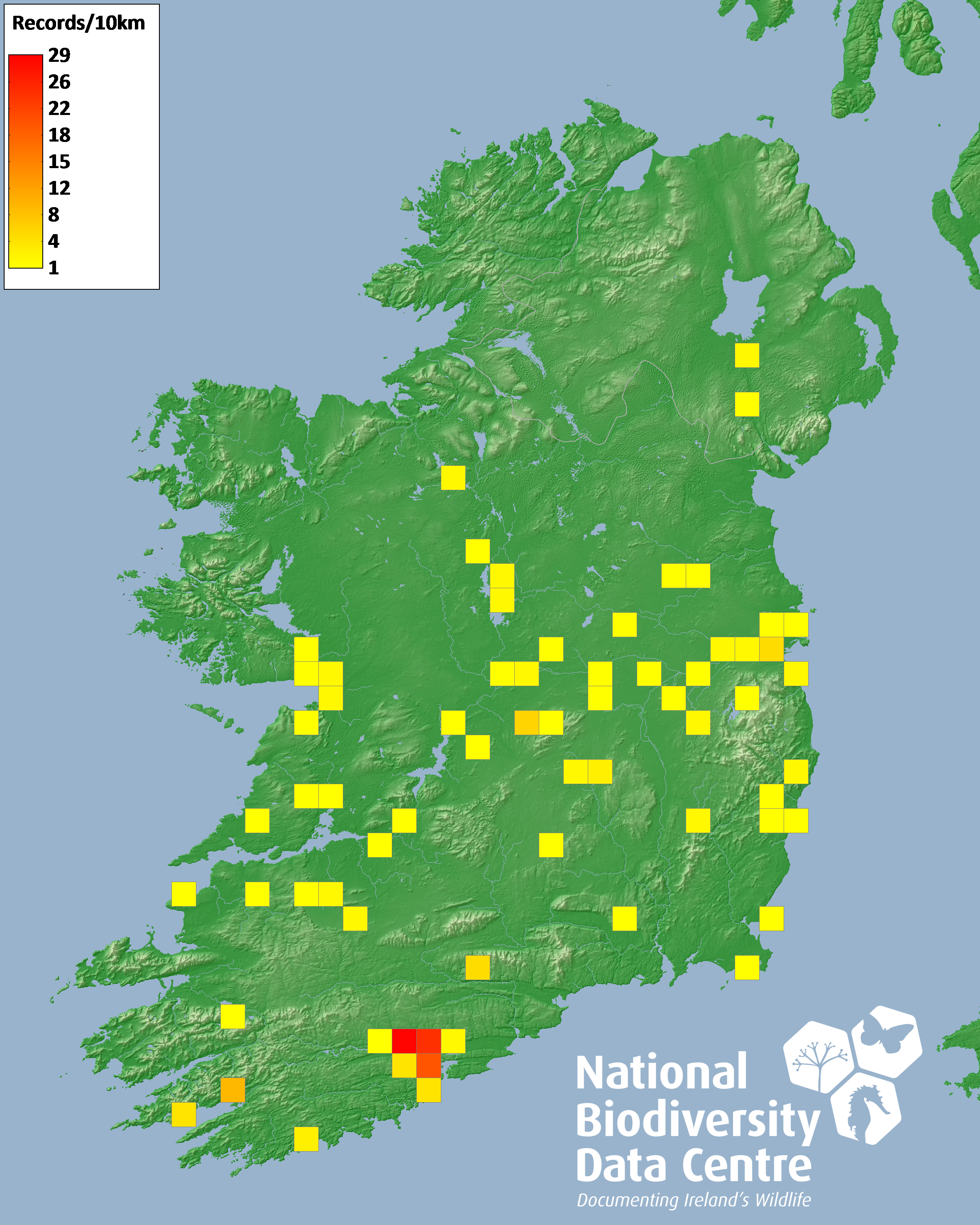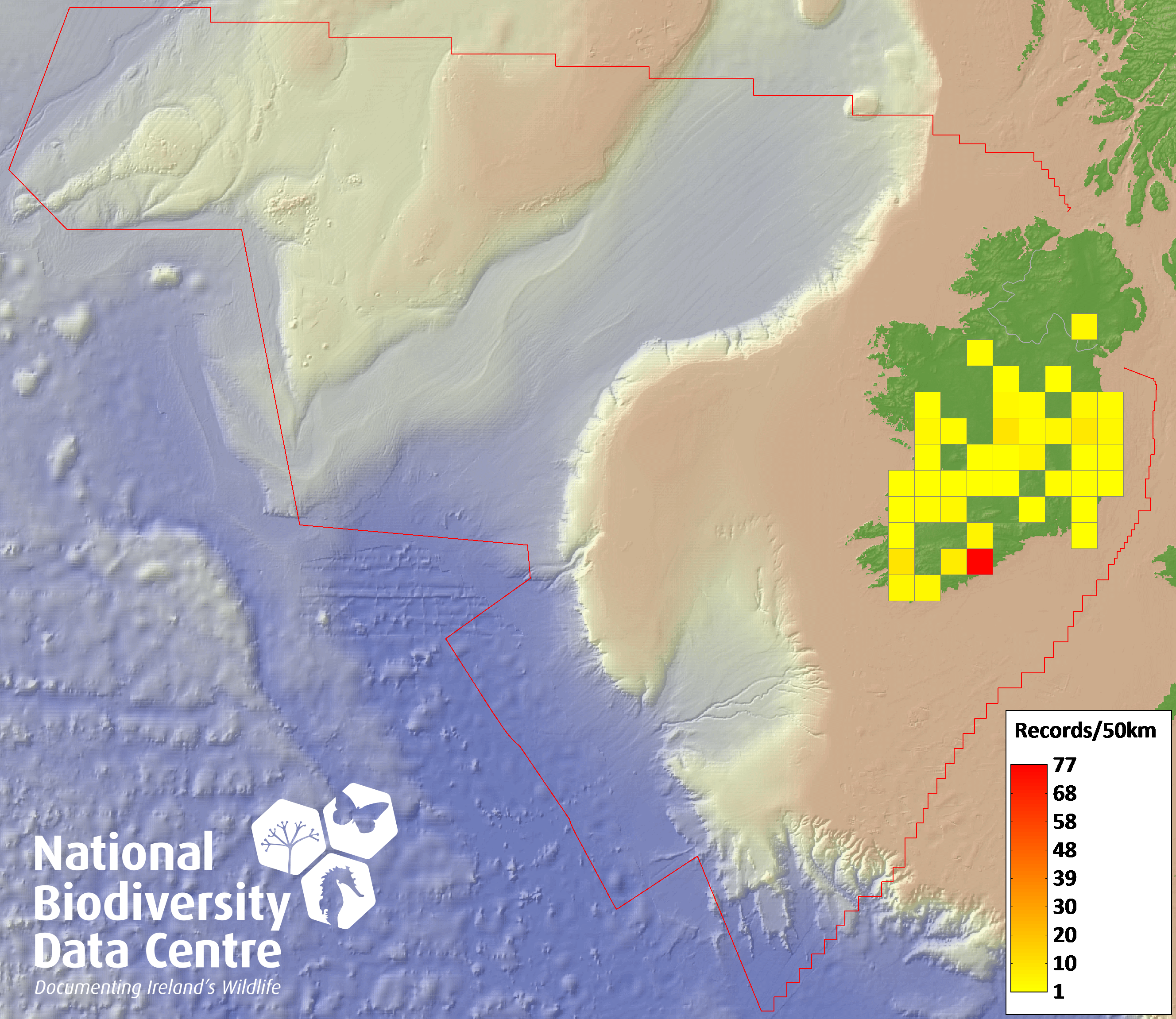 Distribution of the number of records recorded within each 10km grid square (ITM).Marine Map - 50km