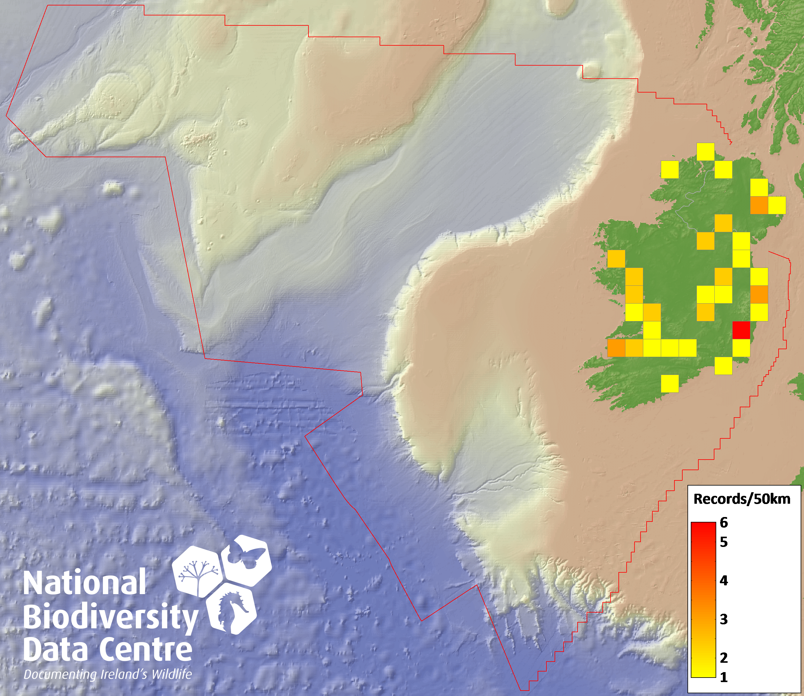 Distribution of the number of records recorded within each 10km grid square (ITM).Marine Map - 50km