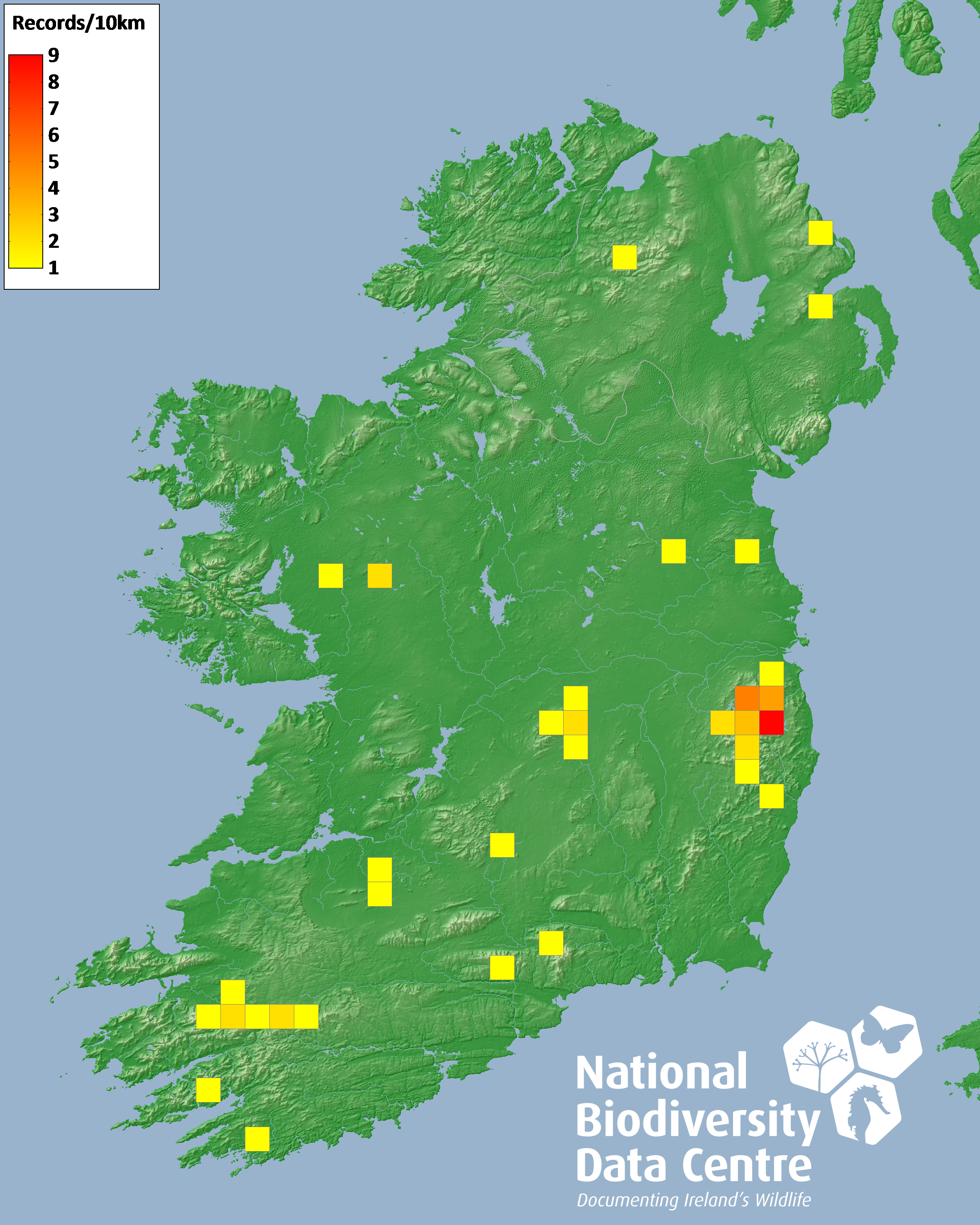 Distribution of the number of records recorded within each 10km grid square (ITM).Marine Map - 50km