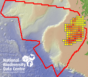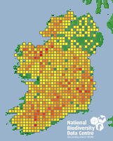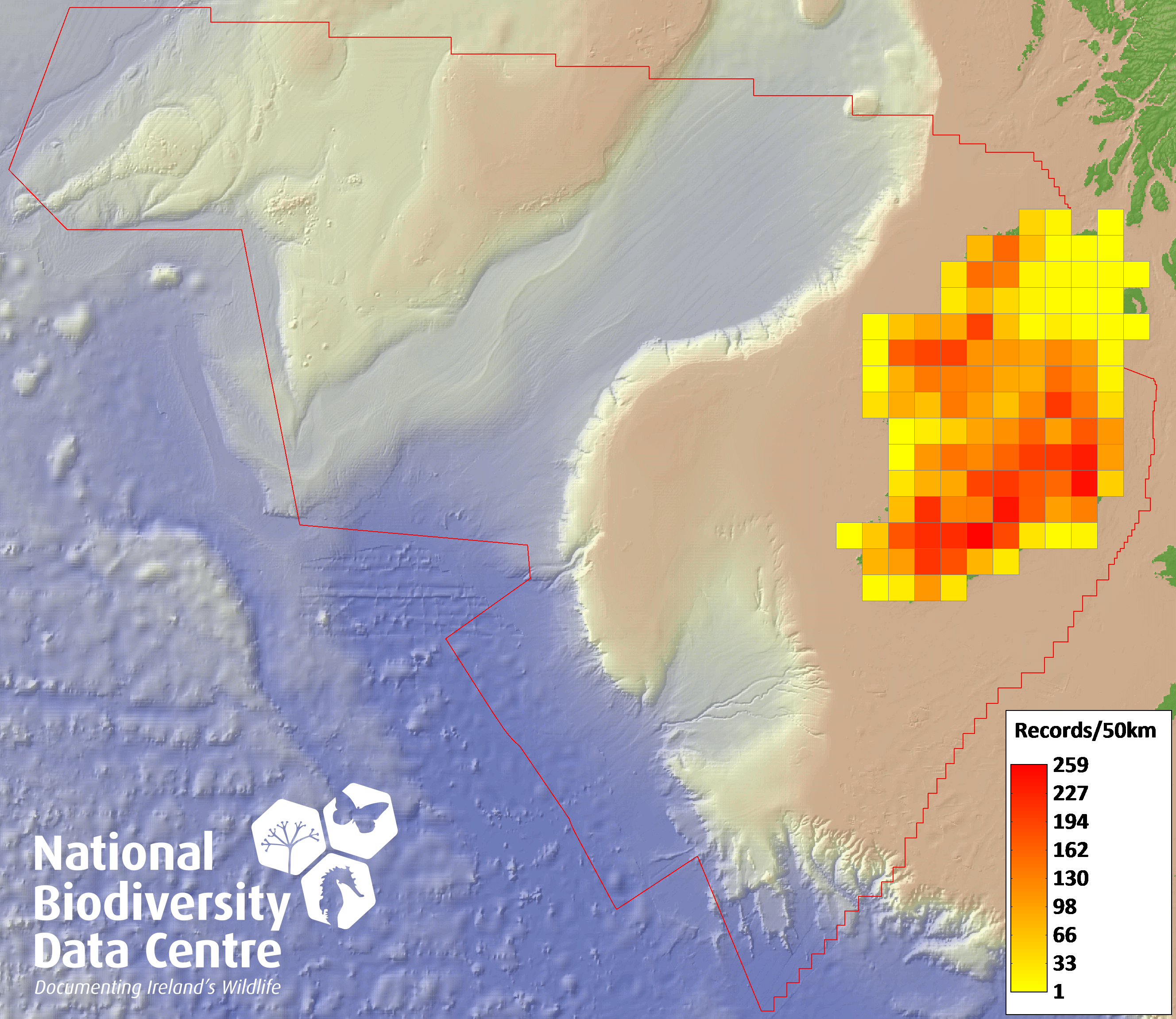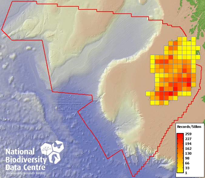 Distribution of the number of records recorded within each 10km grid square (ITM).Marine Map - 50km