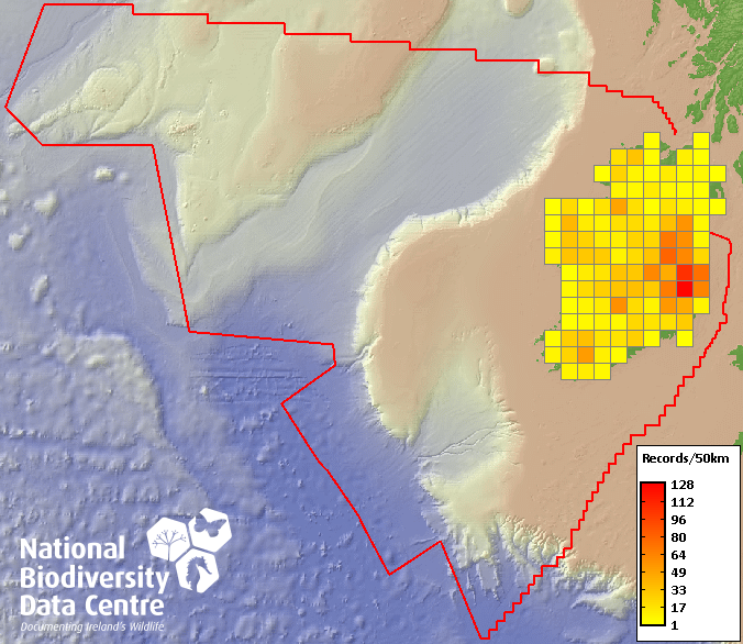 Distribution of the number of records recorded within each 10km grid square (ITM).Marine Map - 50km