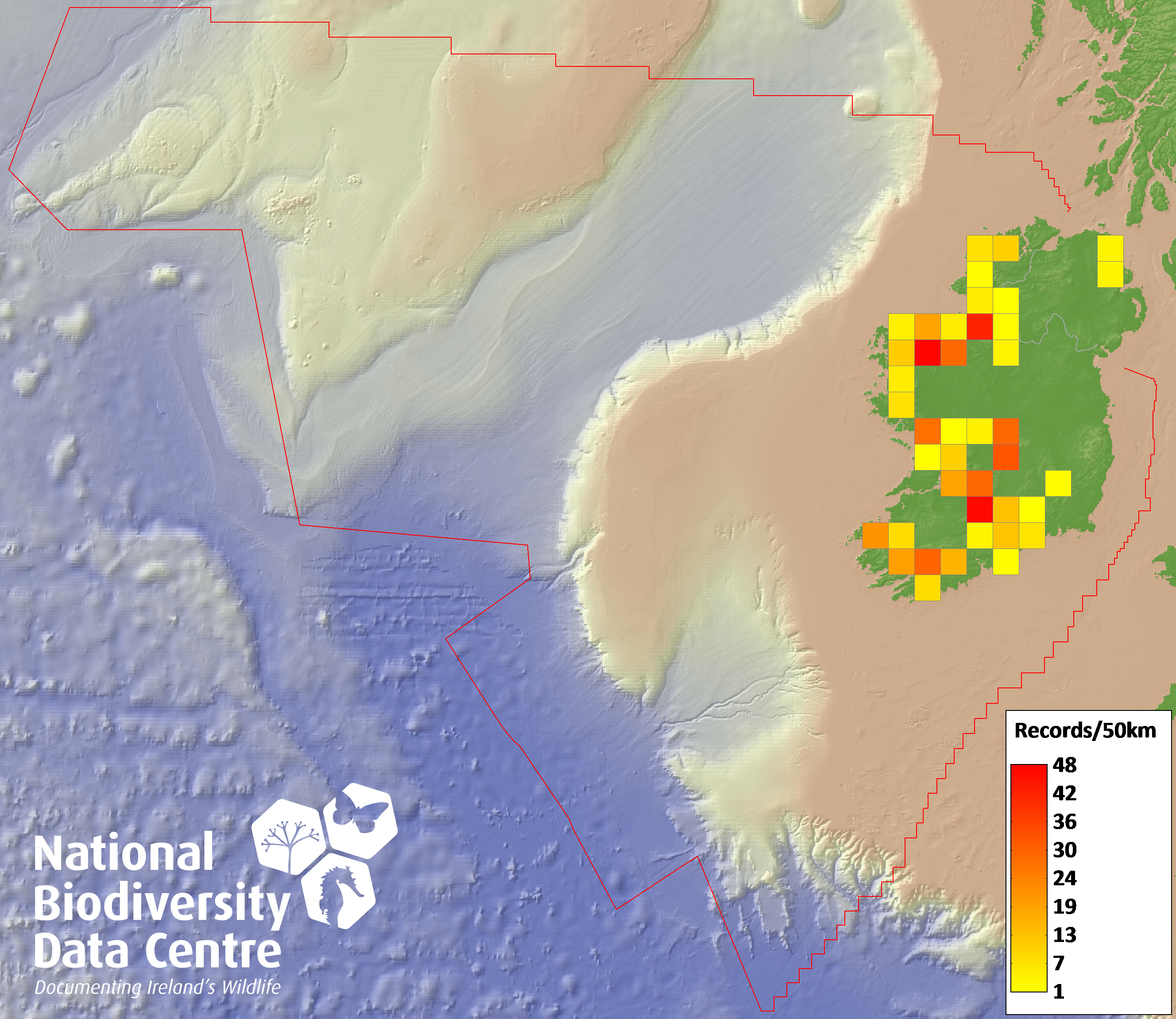 Distribution of the number of records recorded within each 10km grid square (ITM).Marine Map - 50km