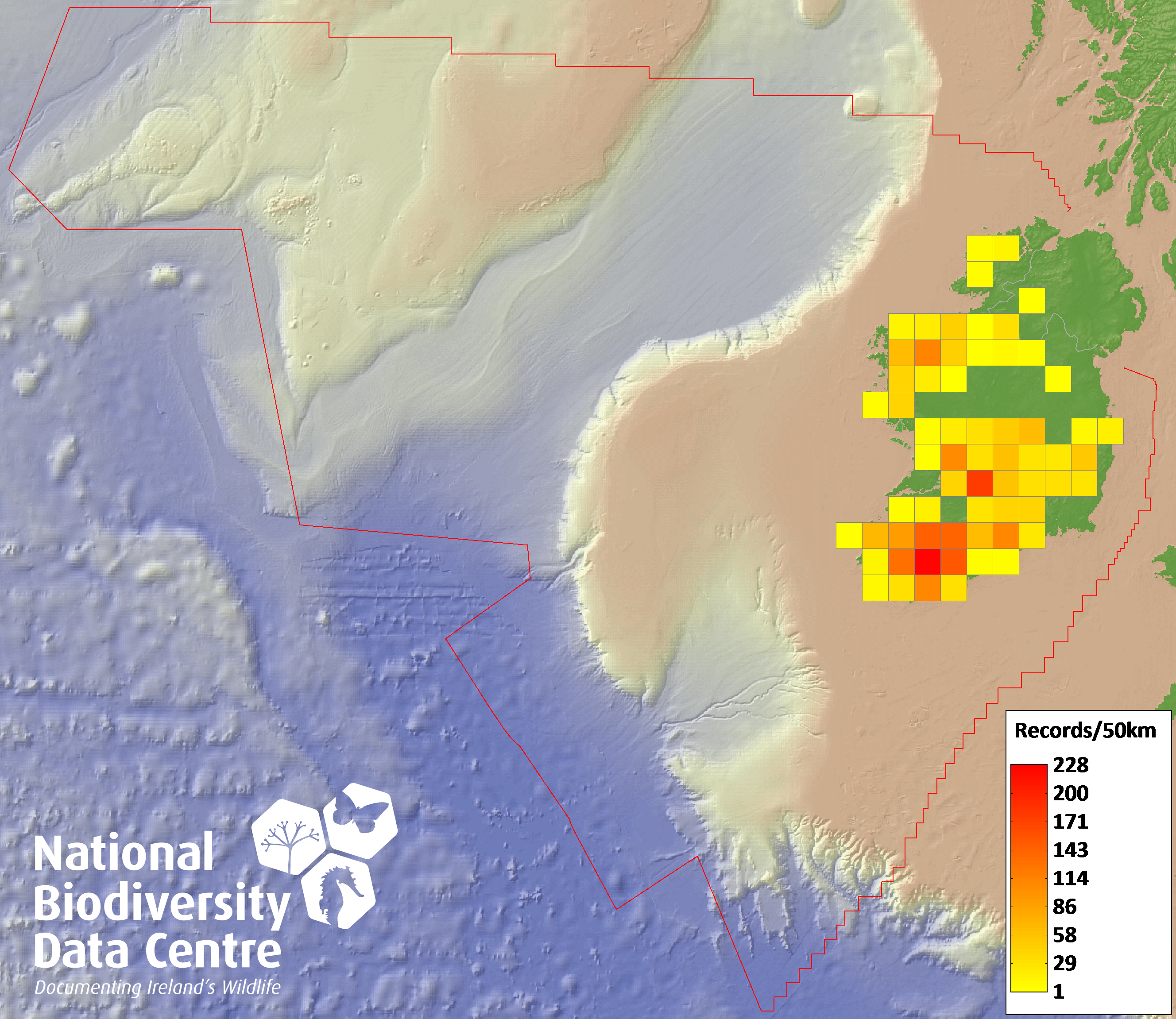 Distribution of the number of records recorded within each 10km grid square (ITM).Marine Map - 50km