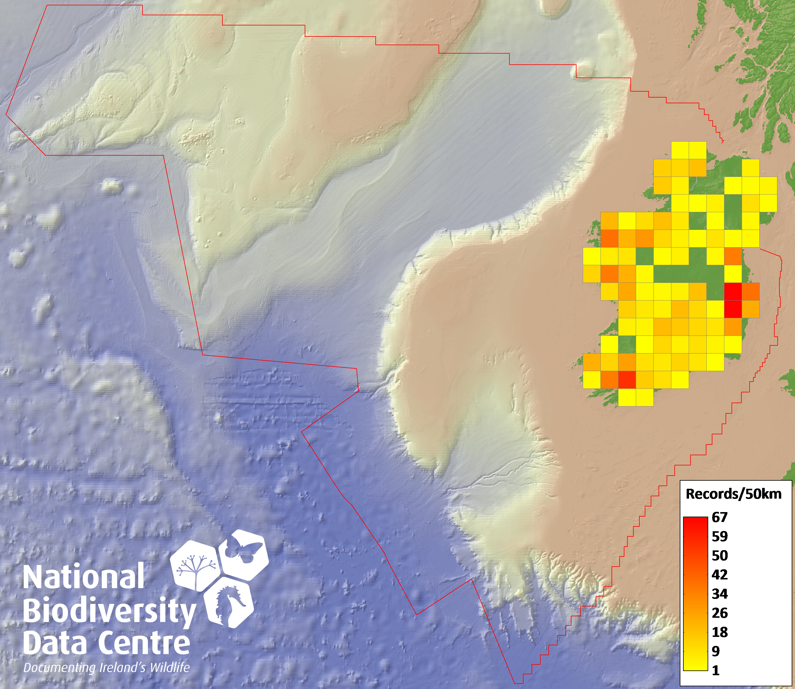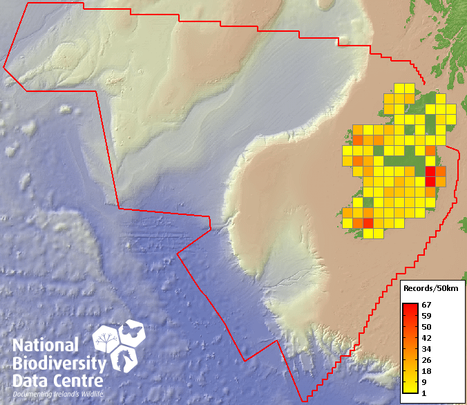 Distribution of the number of records recorded within each 10km grid square (ITM).Marine Map - 50km