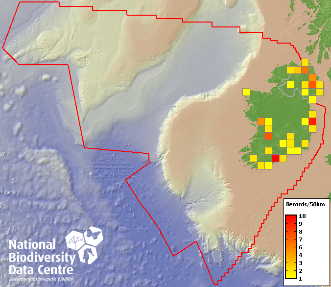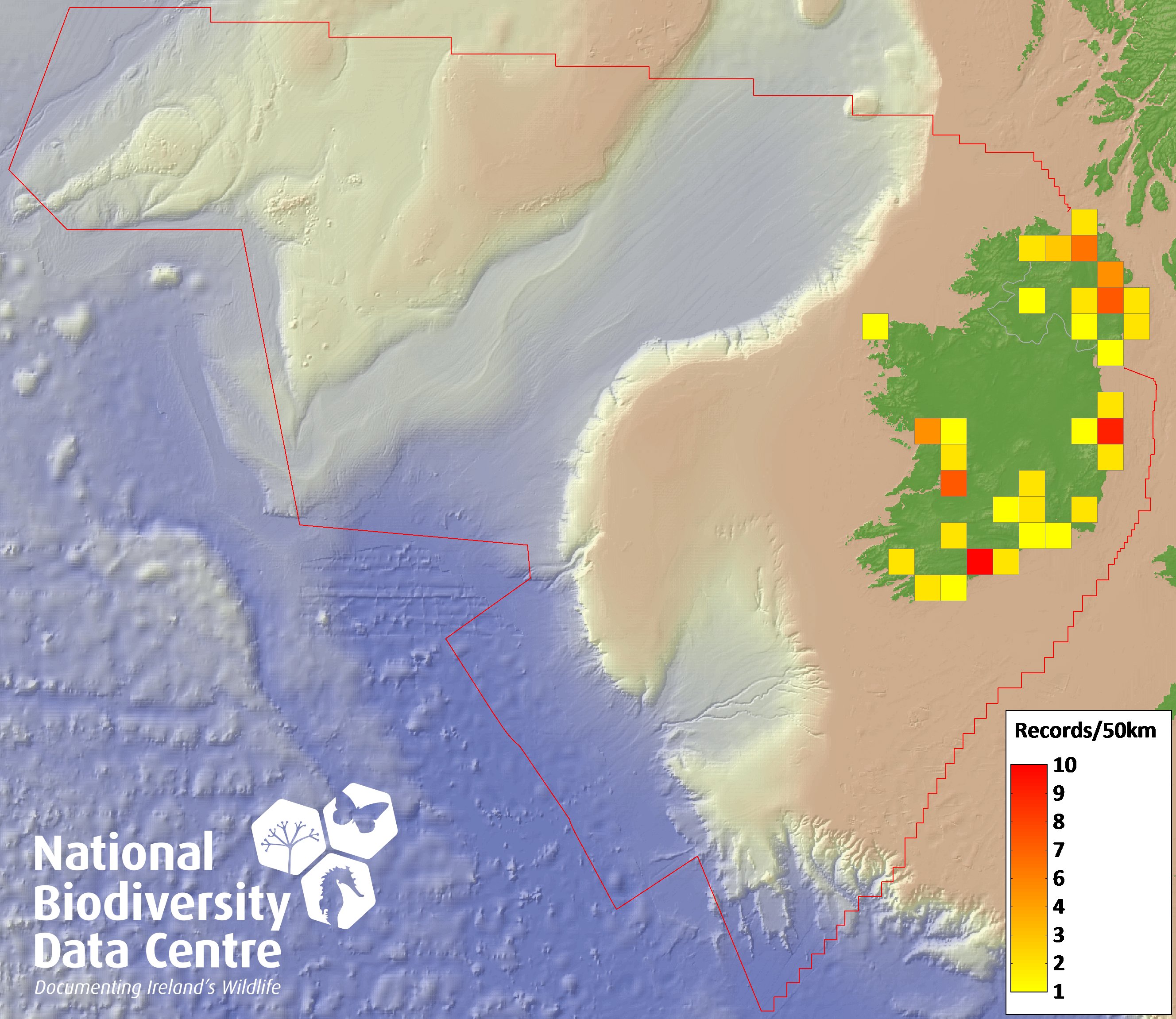 Distribution of the number of records recorded within each 10km grid square (ITM).Marine Map - 50km