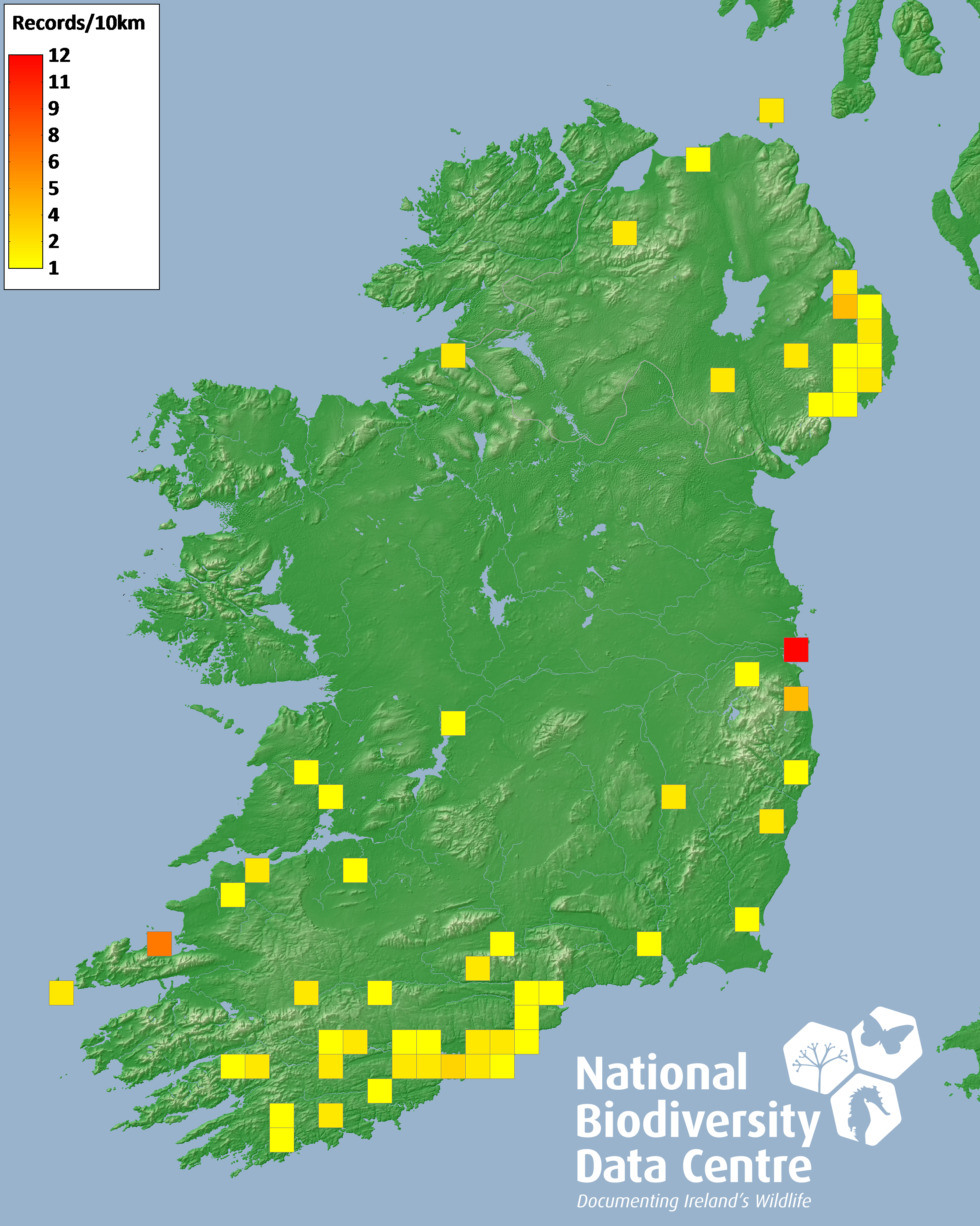 Distribution of the number of records recorded within each 10km grid square (ITM).Marine Map - 50km
