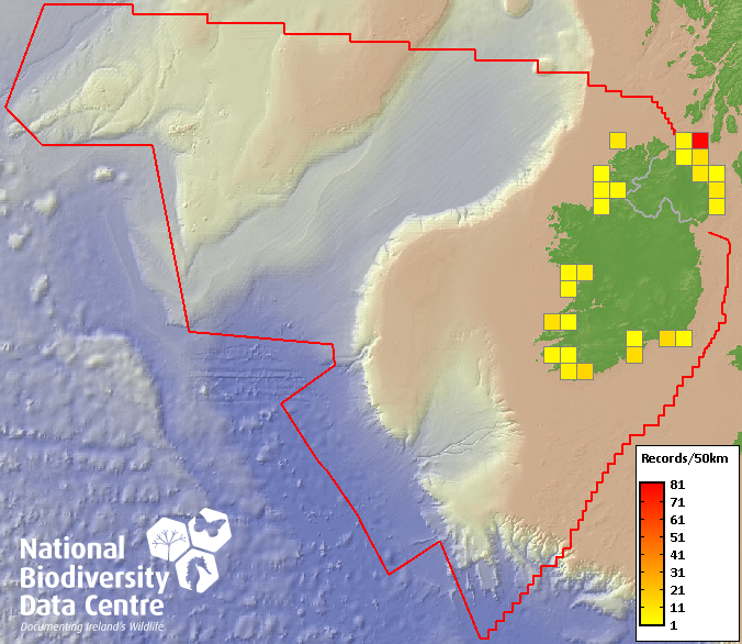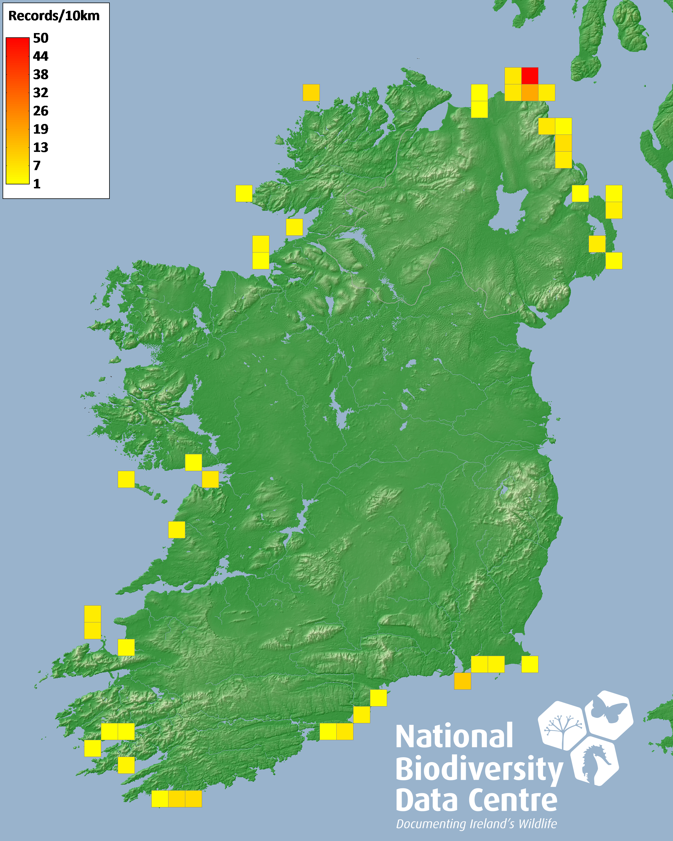 Distribution of the number of records recorded within each 10km grid square (ITM).Marine Map - 50km