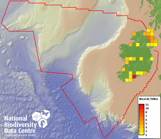 Distribution of the number of records recorded within each 10km grid square (ITM).Marine Map - 50km