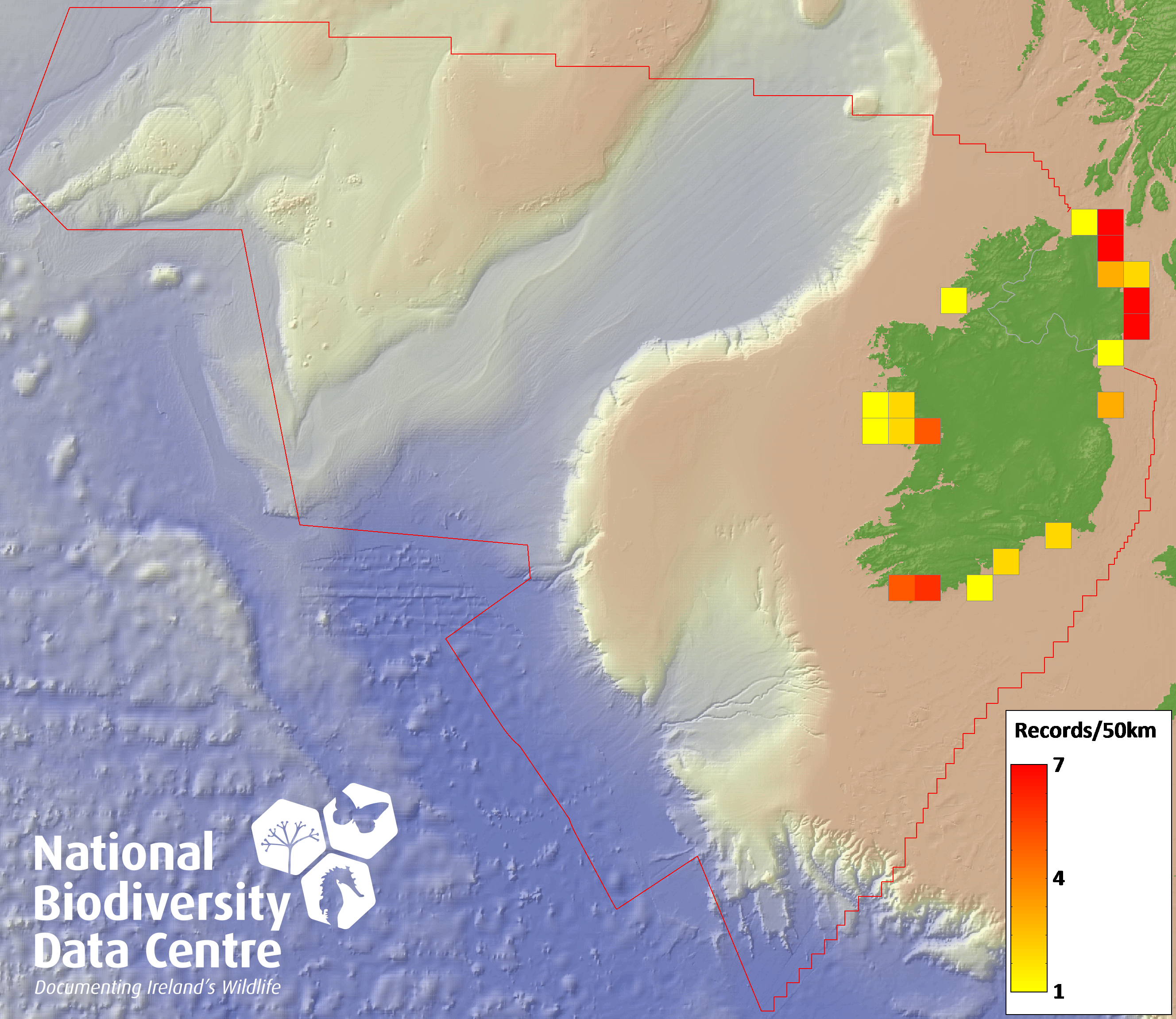 Distribution of the number of records recorded within each 10km grid square (ITM).Marine Map - 50km