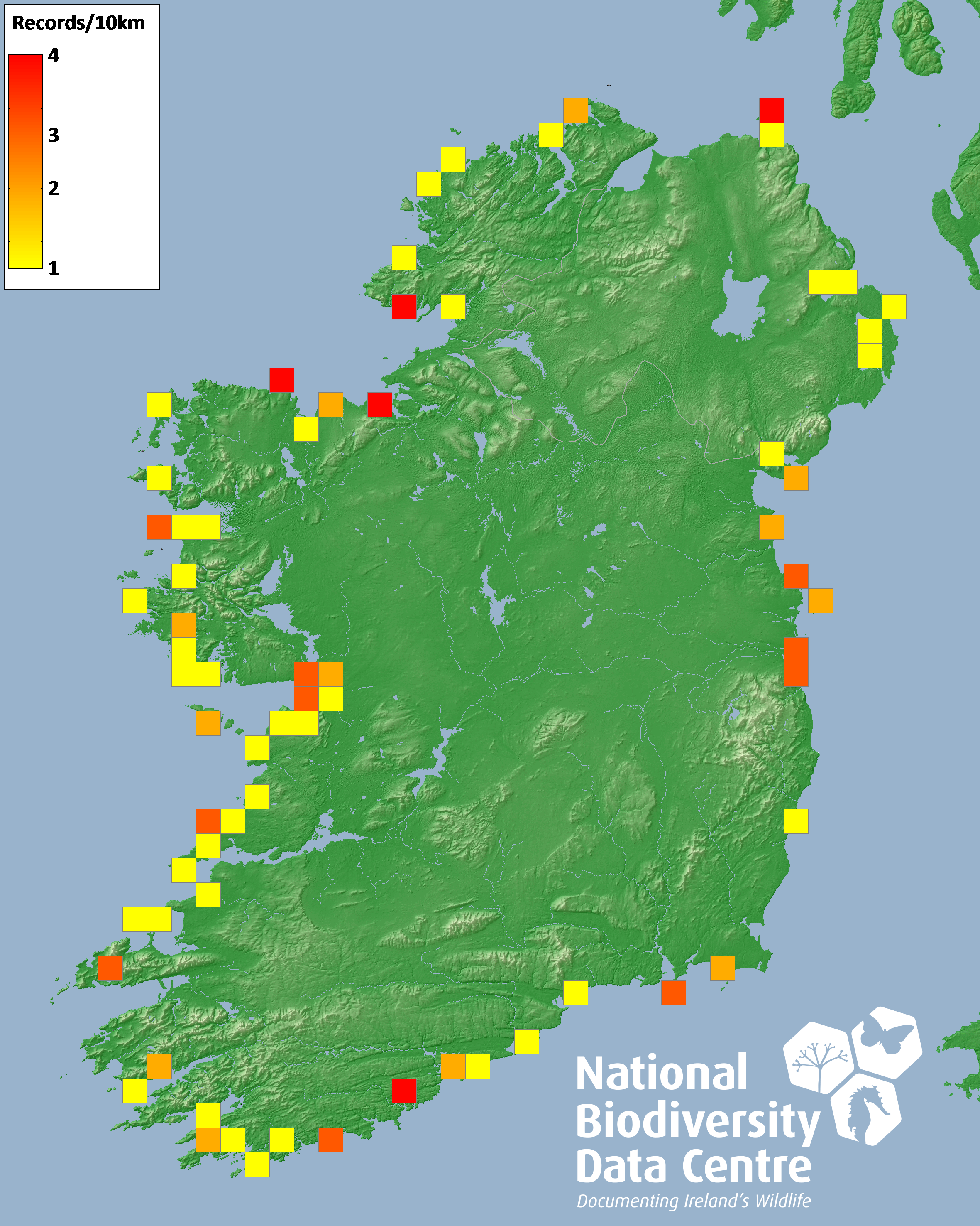 Distribution of the number of records recorded within each 10km grid square (ITM).Marine Map - 50km