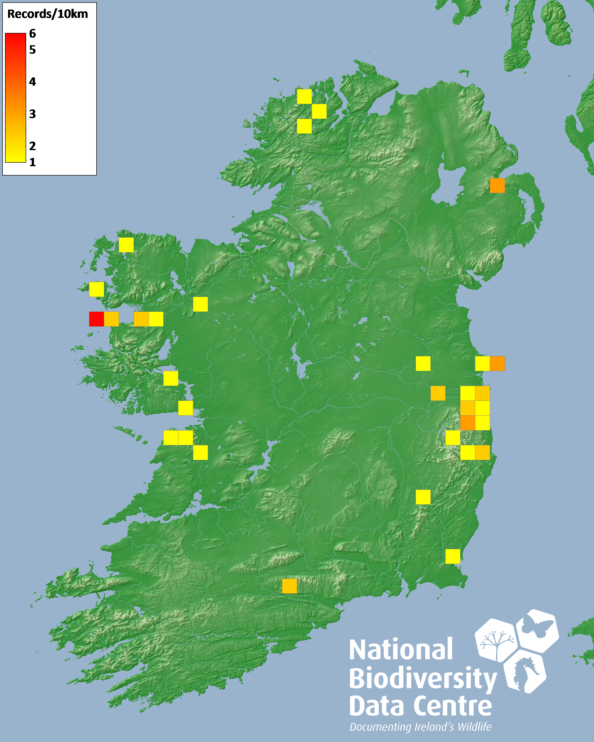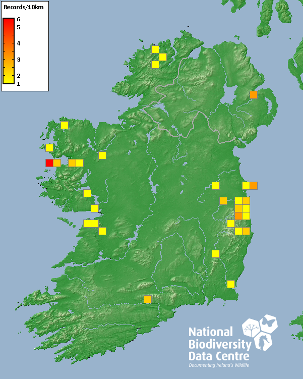Distribution of the number of records recorded within each 10km grid square (ITM).Marine Map - 50km