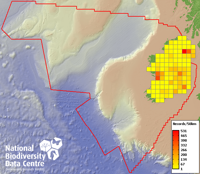 Distribution of the number of records recorded within each 10km grid square (ITM).Marine Map - 50km