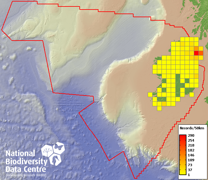 Distribution of the number of records recorded within each 10km grid square (ITM).Marine Map - 50km