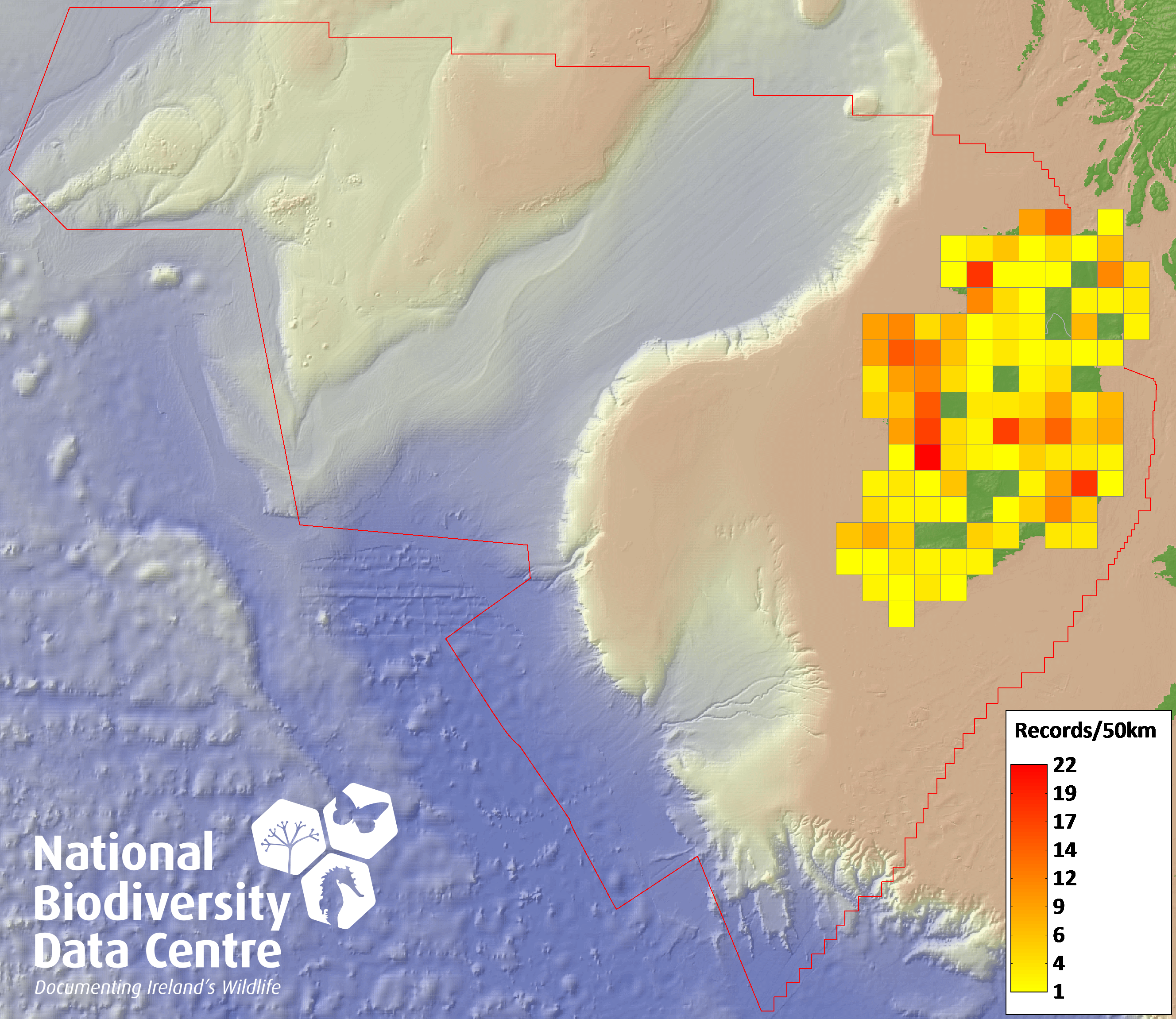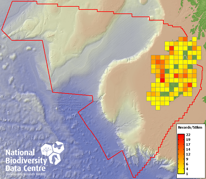 Distribution of the number of records recorded within each 10km grid square (ITM).Marine Map - 50km