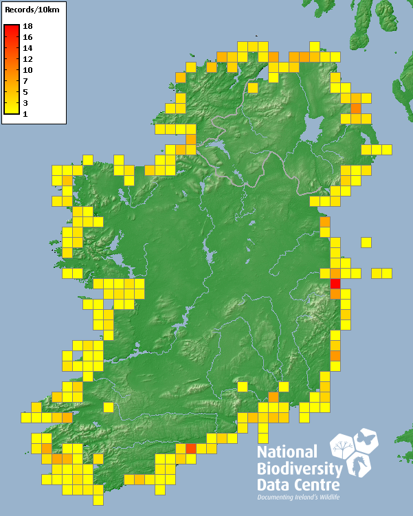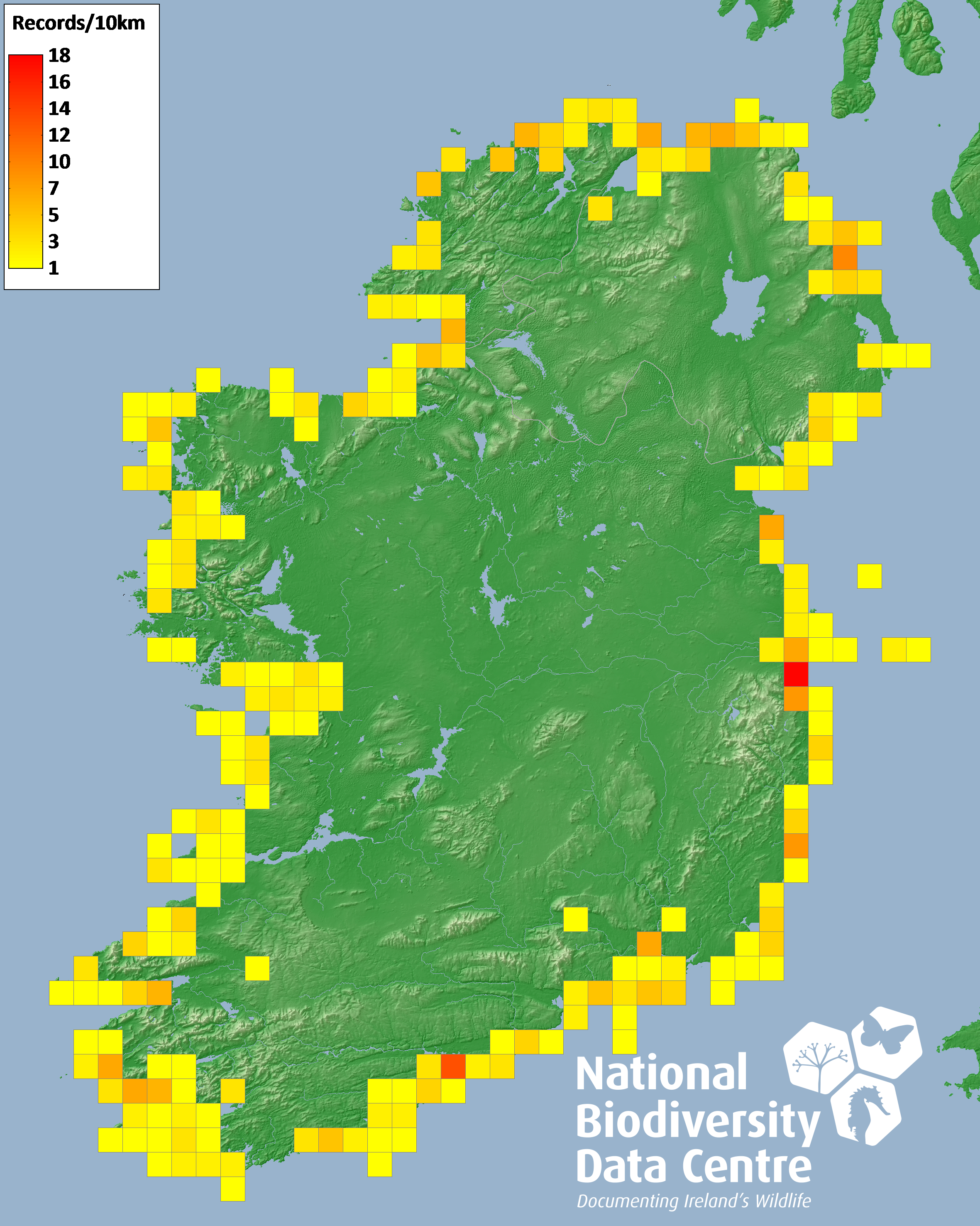 Distribution of the number of records recorded within each 10km grid square (ITM).Marine Map - 50km