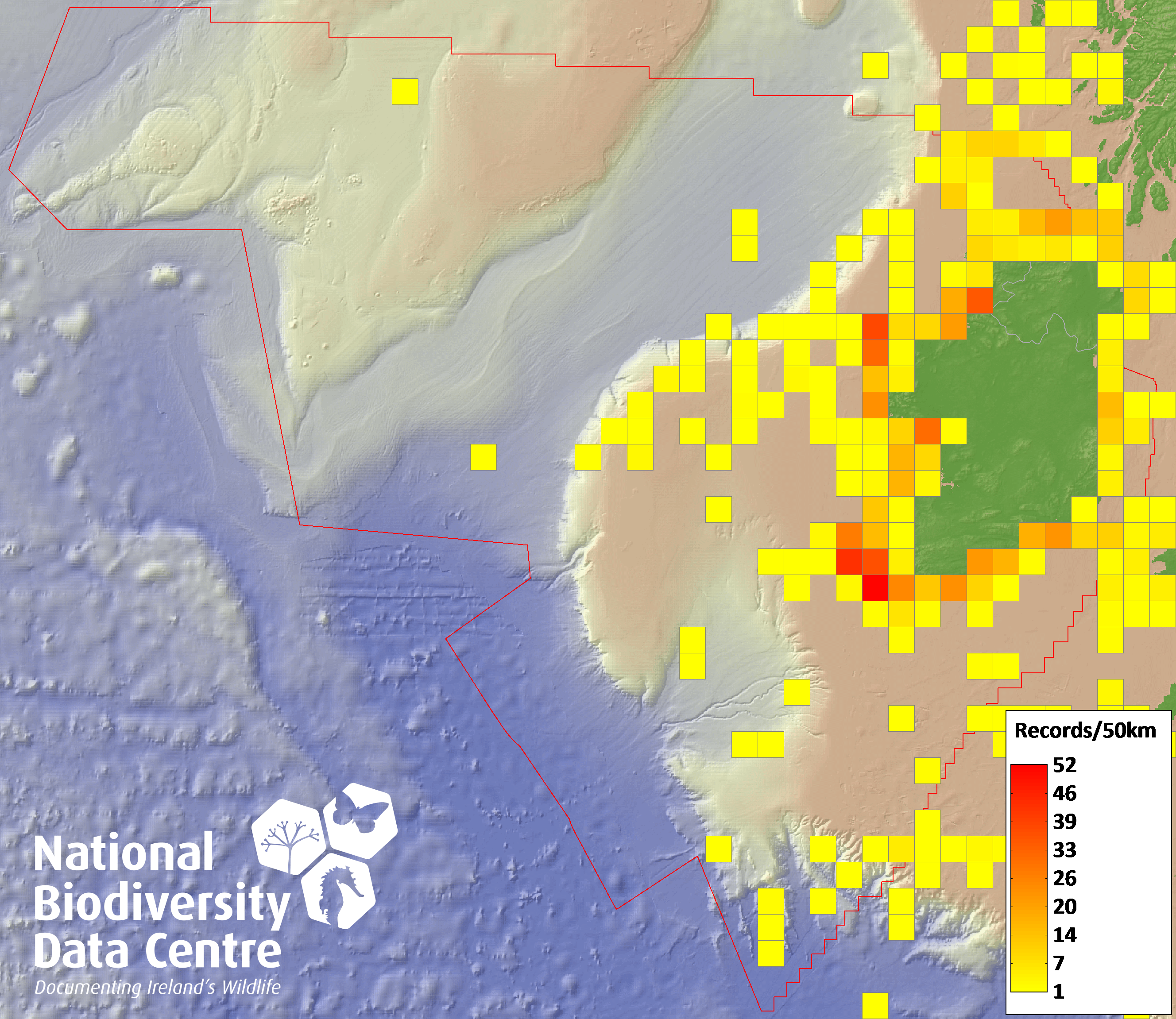 Distribution of the number of records recorded within each 10km grid square (ITM).Marine Map - 50km
