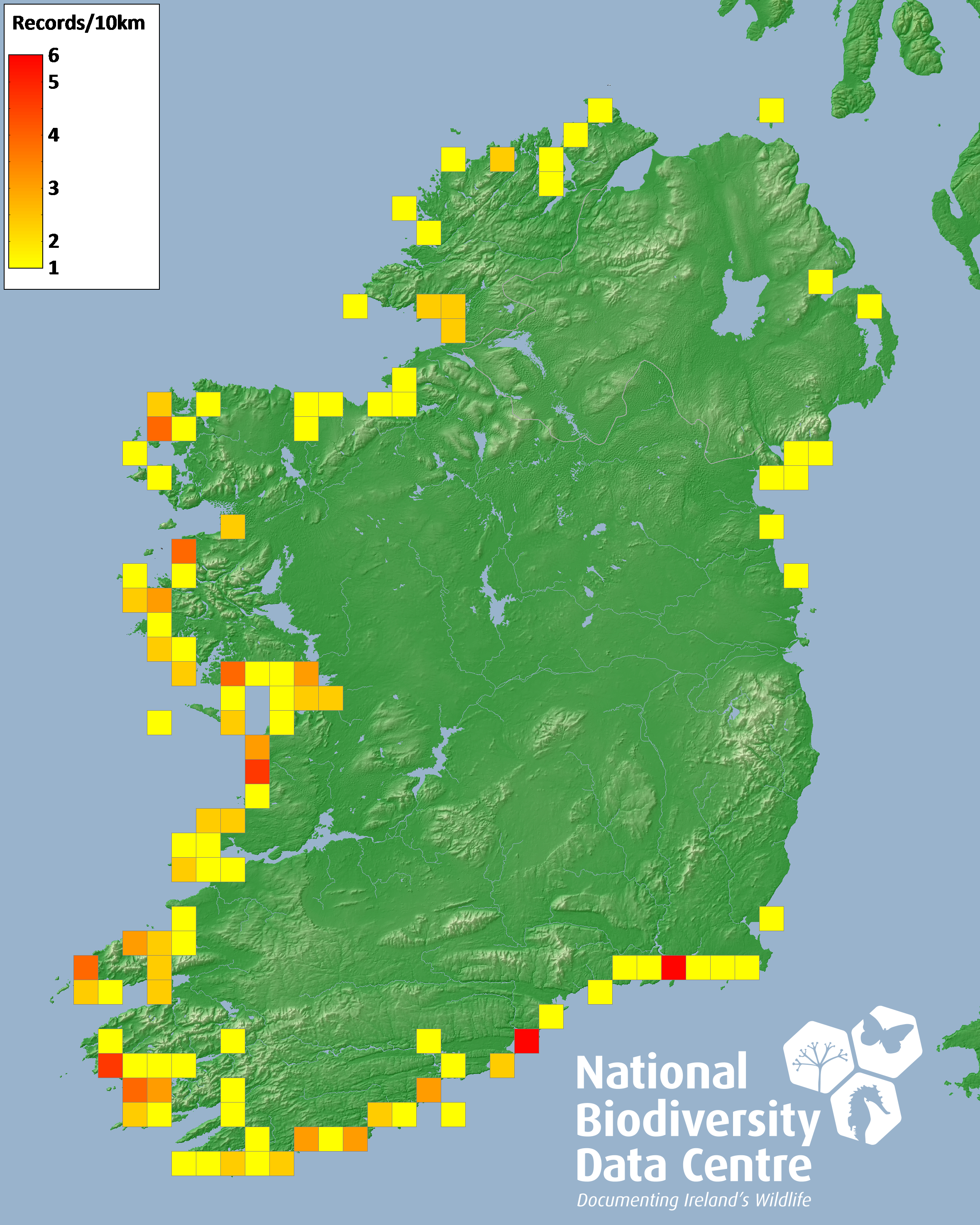 Distribution of the number of records recorded within each 10km grid square (ITM).Marine Map - 50km