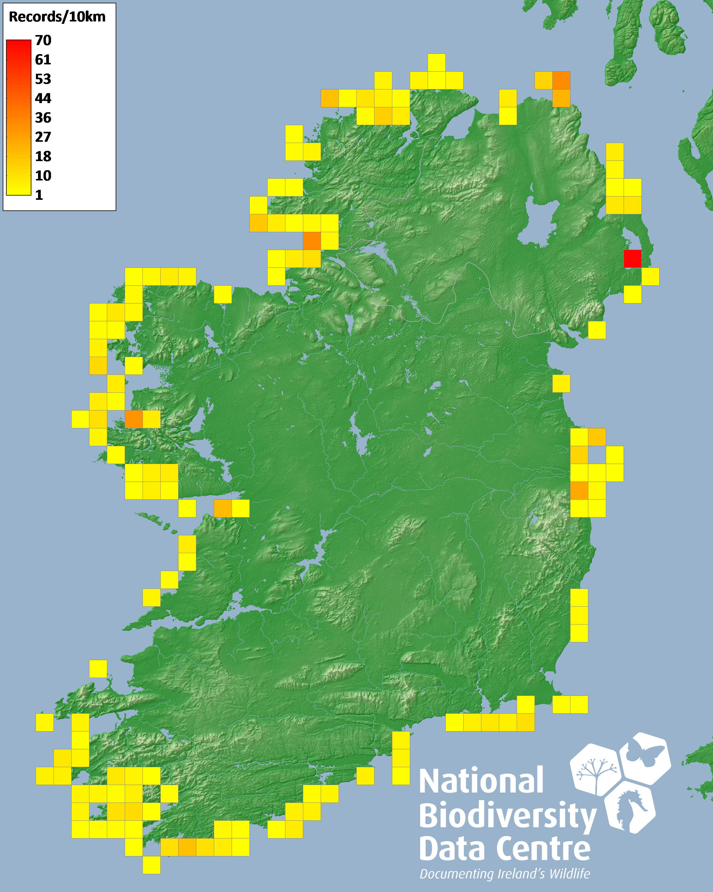 Distribution of the number of records recorded within each 10km grid square (ITM).Marine Map - 50km
