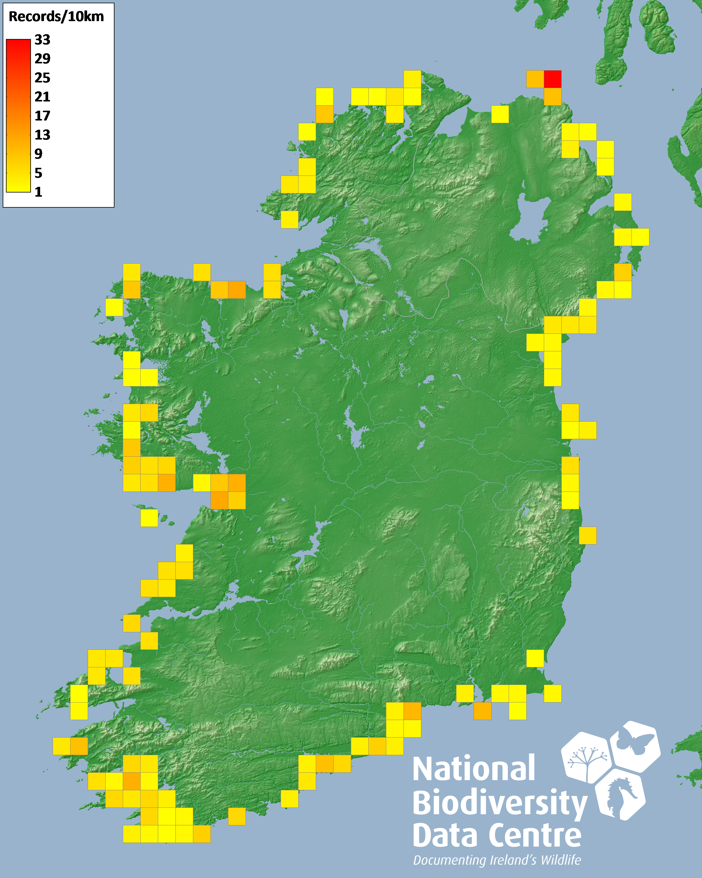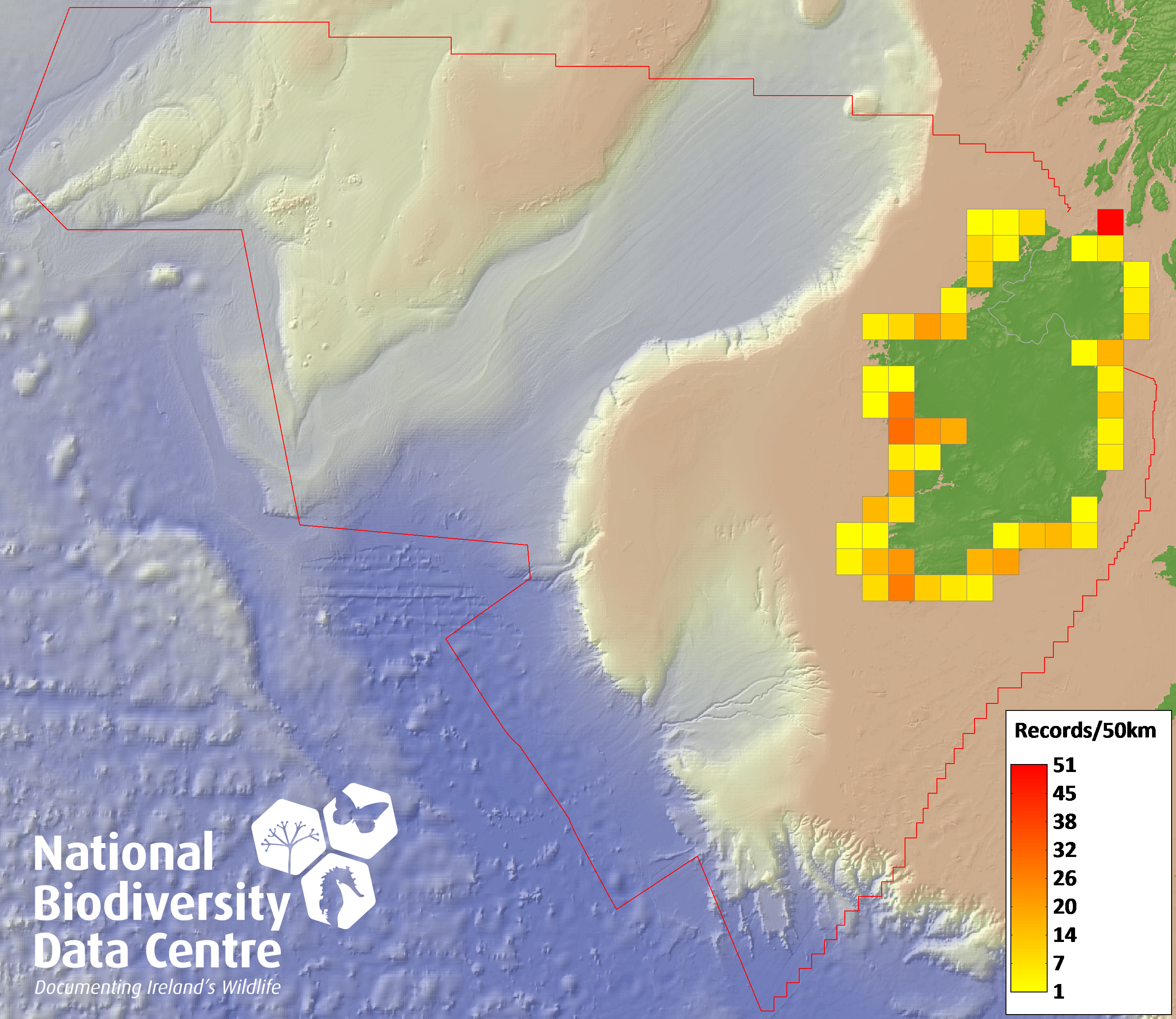 Distribution of the number of records recorded within each 10km grid square (ITM).Marine Map - 50km