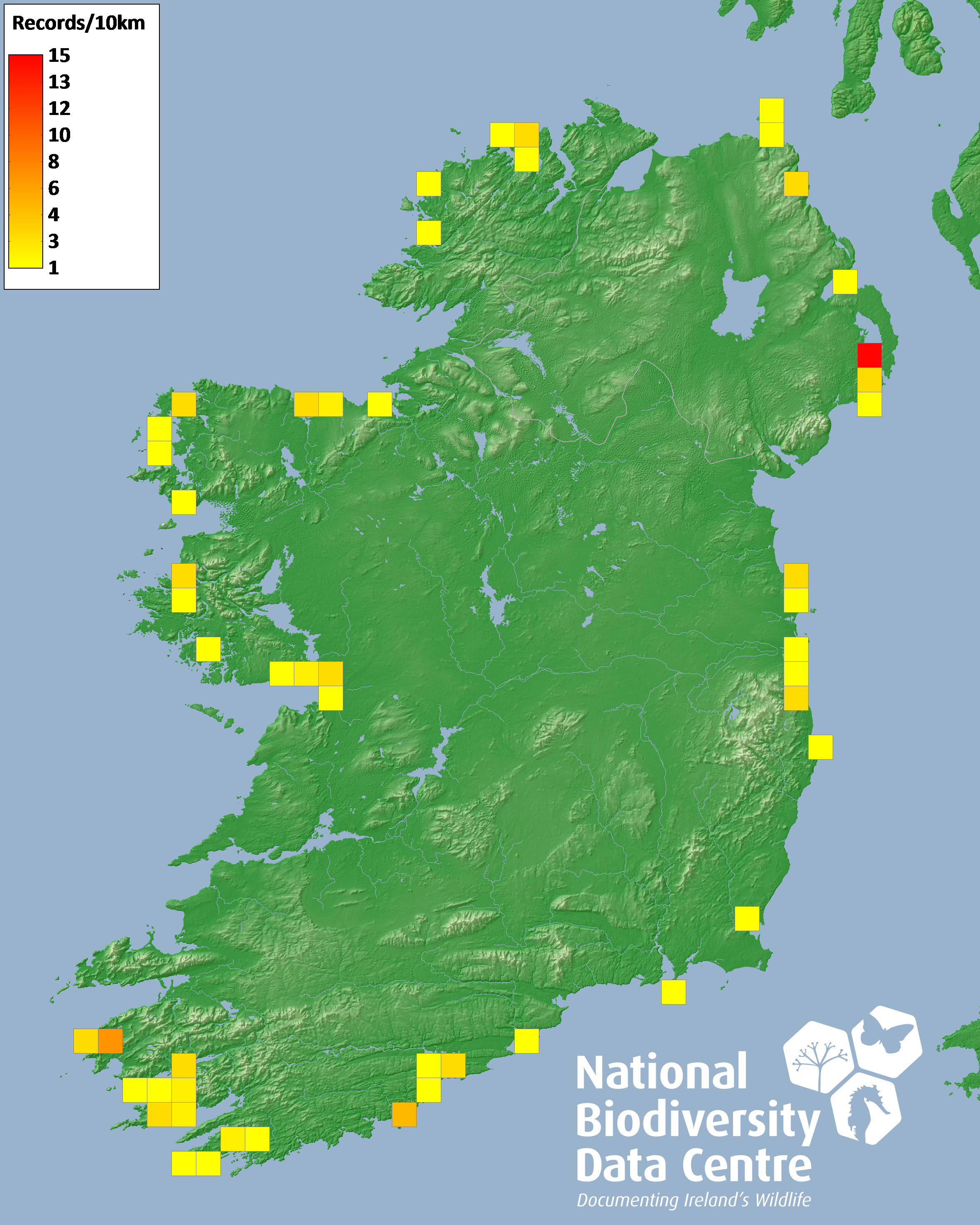 Distribution of the number of records recorded within each 10km grid square (ITM).Marine Map - 50km