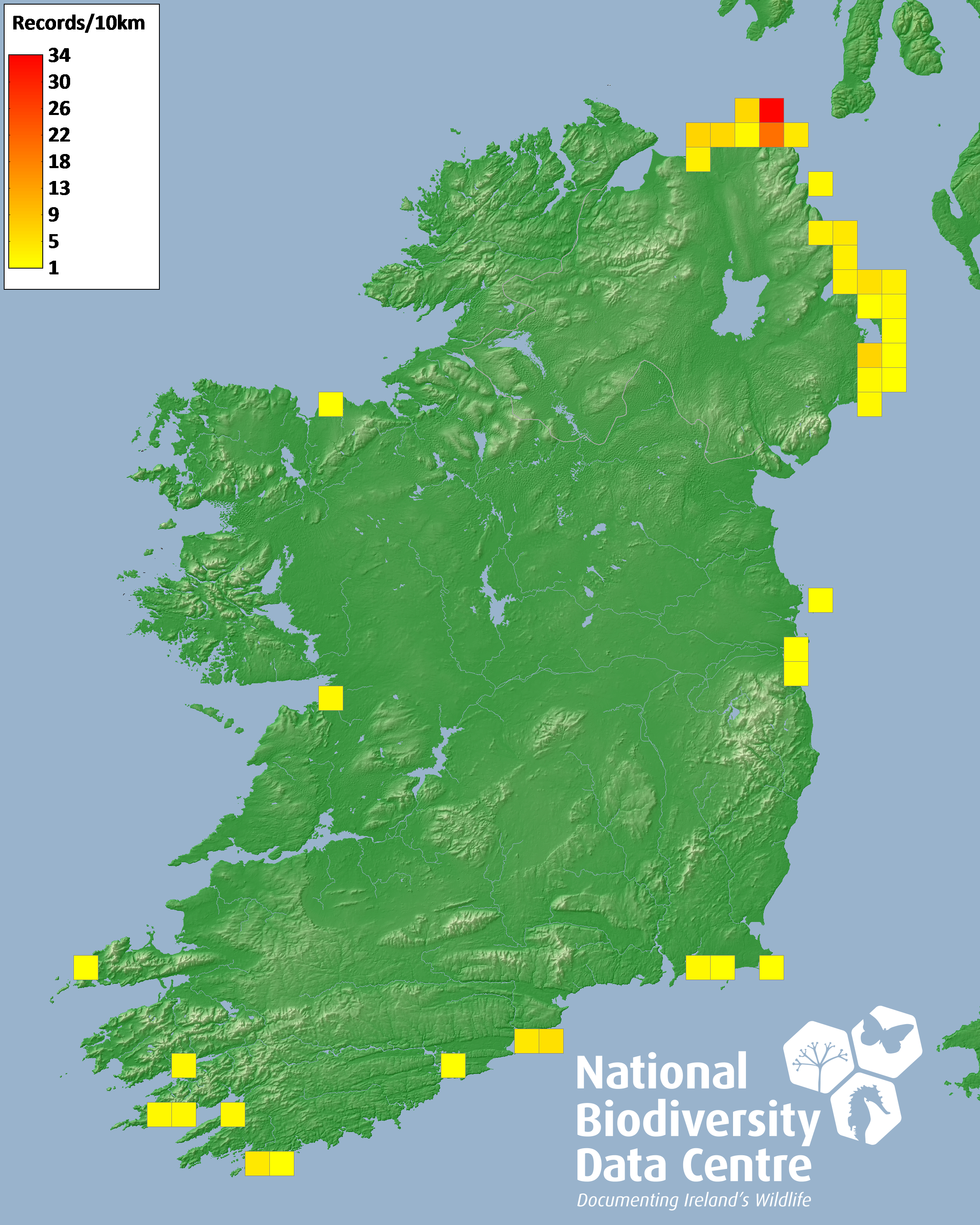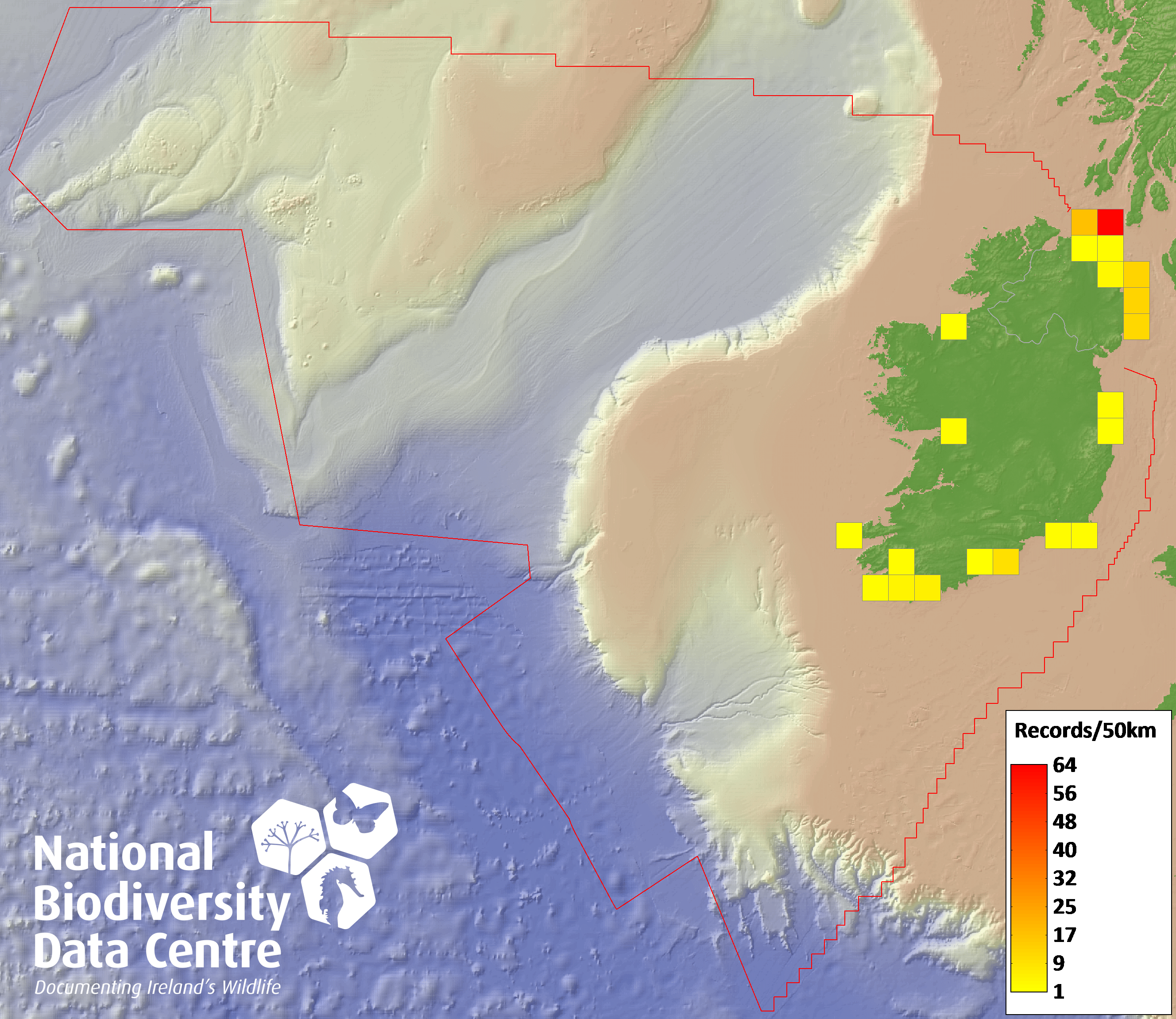 Distribution of the number of records recorded within each 10km grid square (ITM).Marine Map - 50km
