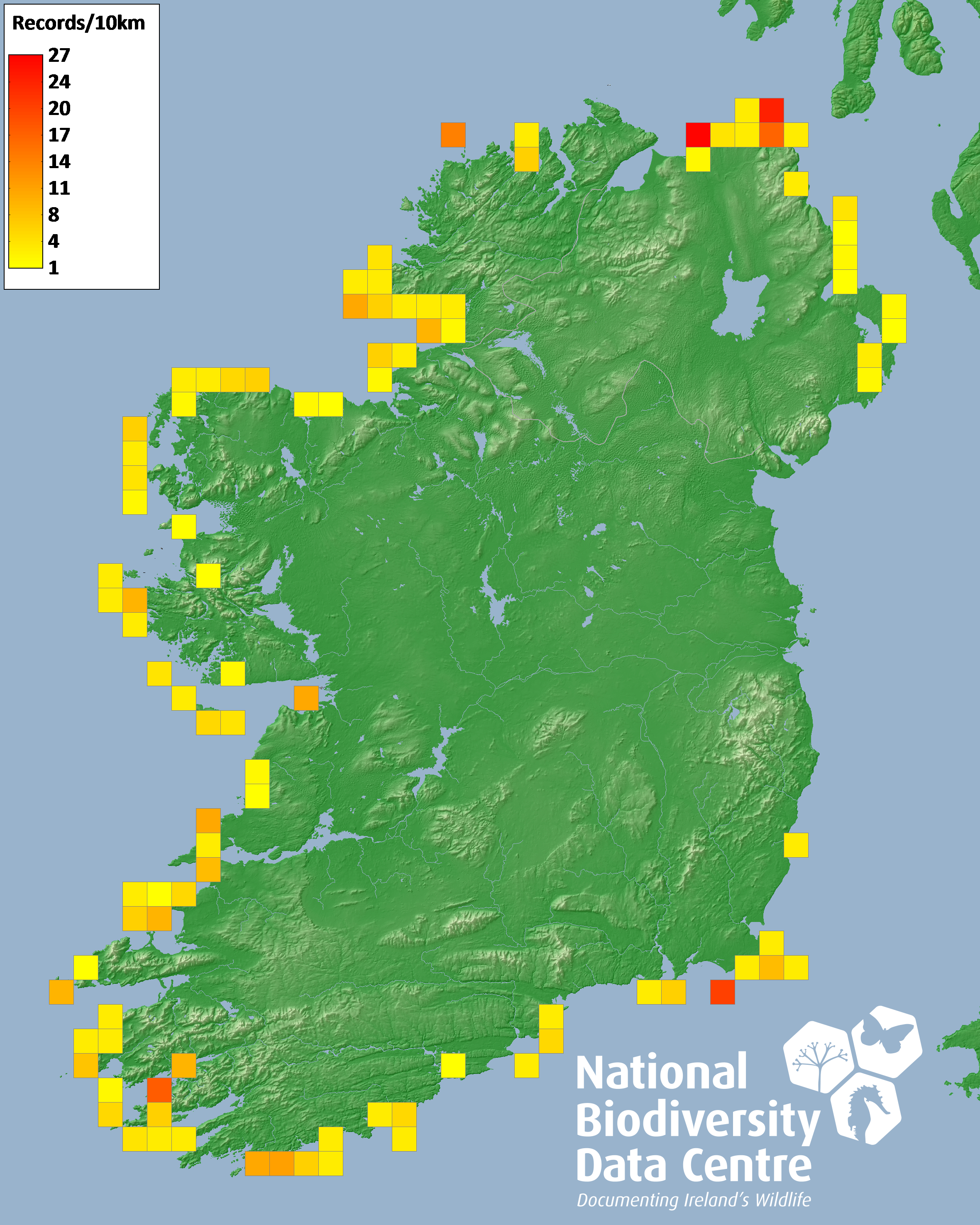 Distribution of the number of records recorded within each 10km grid square (ITM).Marine Map - 50km