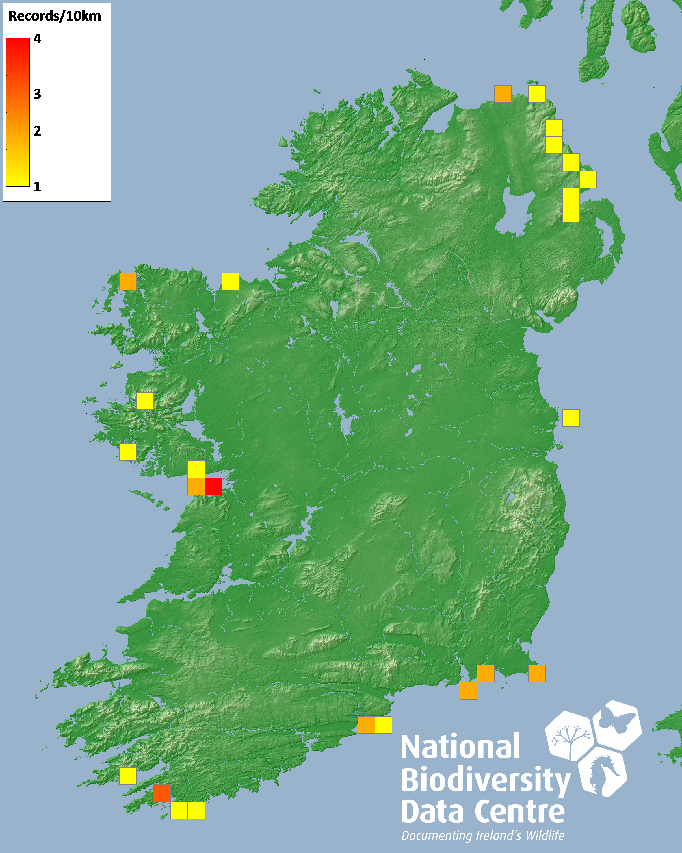 Distribution of the number of records recorded within each 10km grid square (ITM).Marine Map - 50km