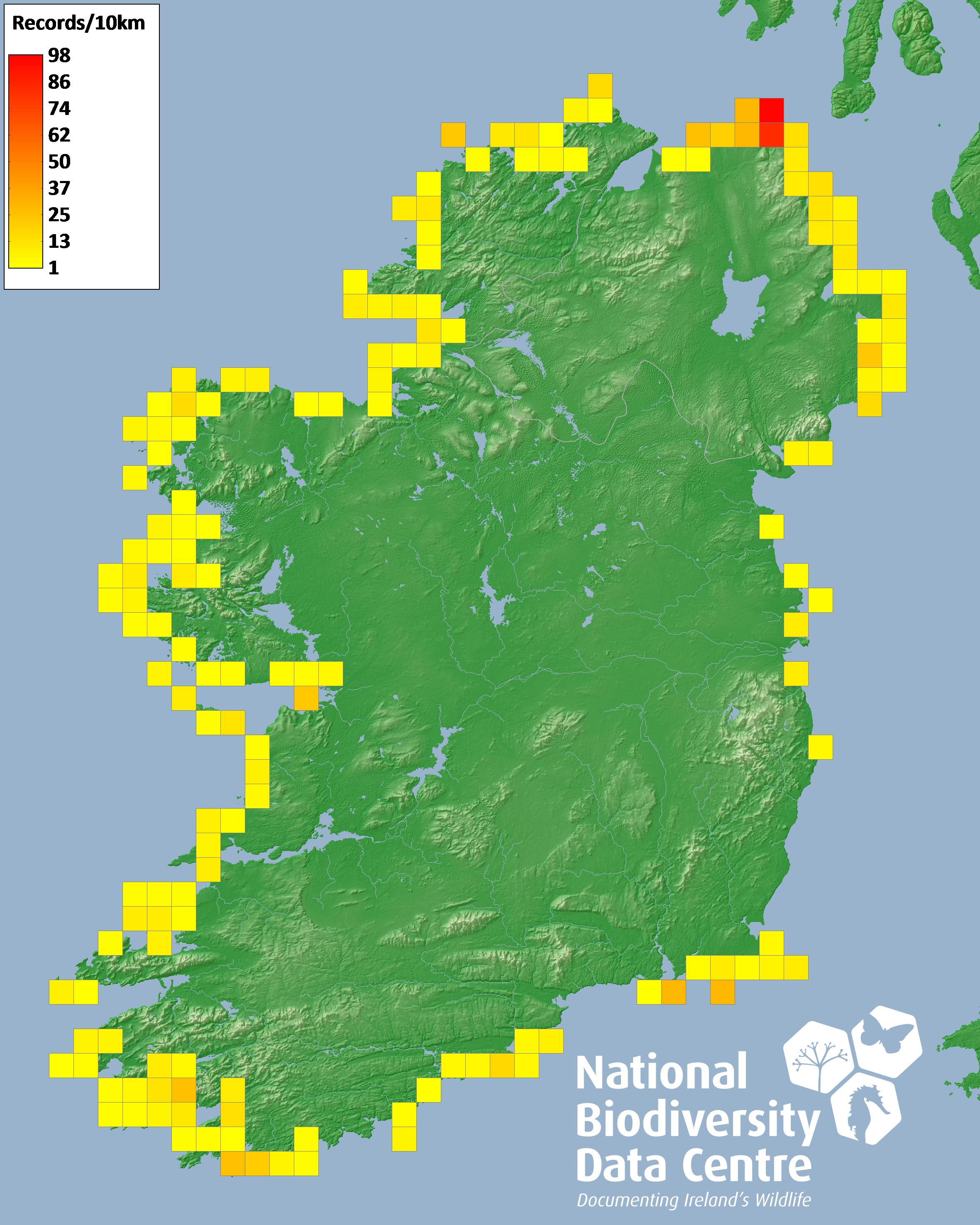 Distribution of the number of records recorded within each 10km grid square (ITM).Marine Map - 50km