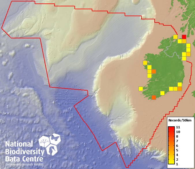 Distribution of the number of records recorded within each 10km grid square (ITM).Marine Map - 50km
