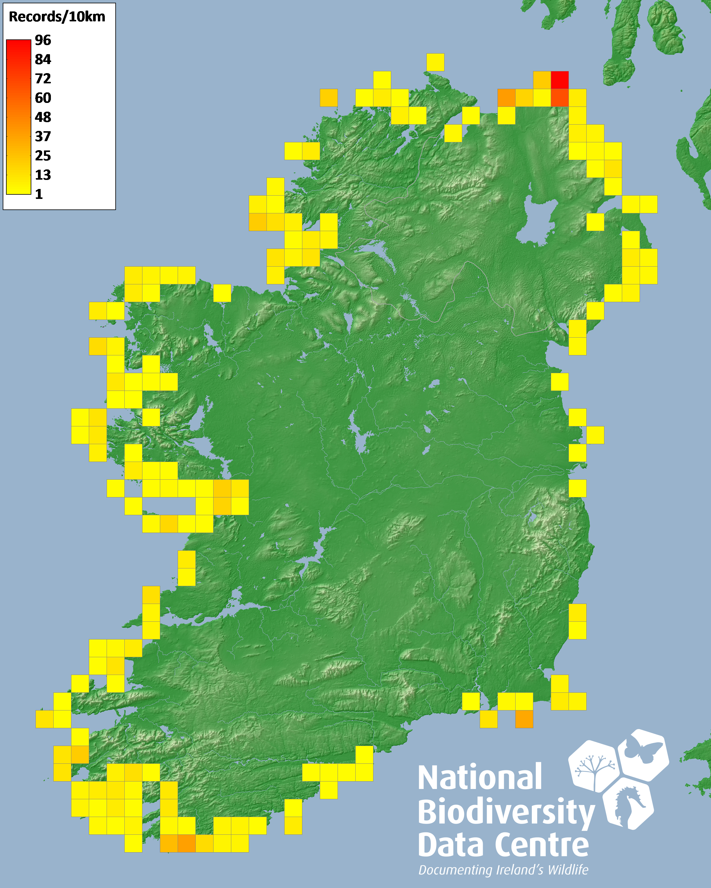 Distribution of the number of records recorded within each 10km grid square (ITM).Marine Map - 50km