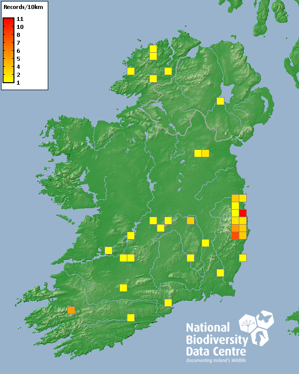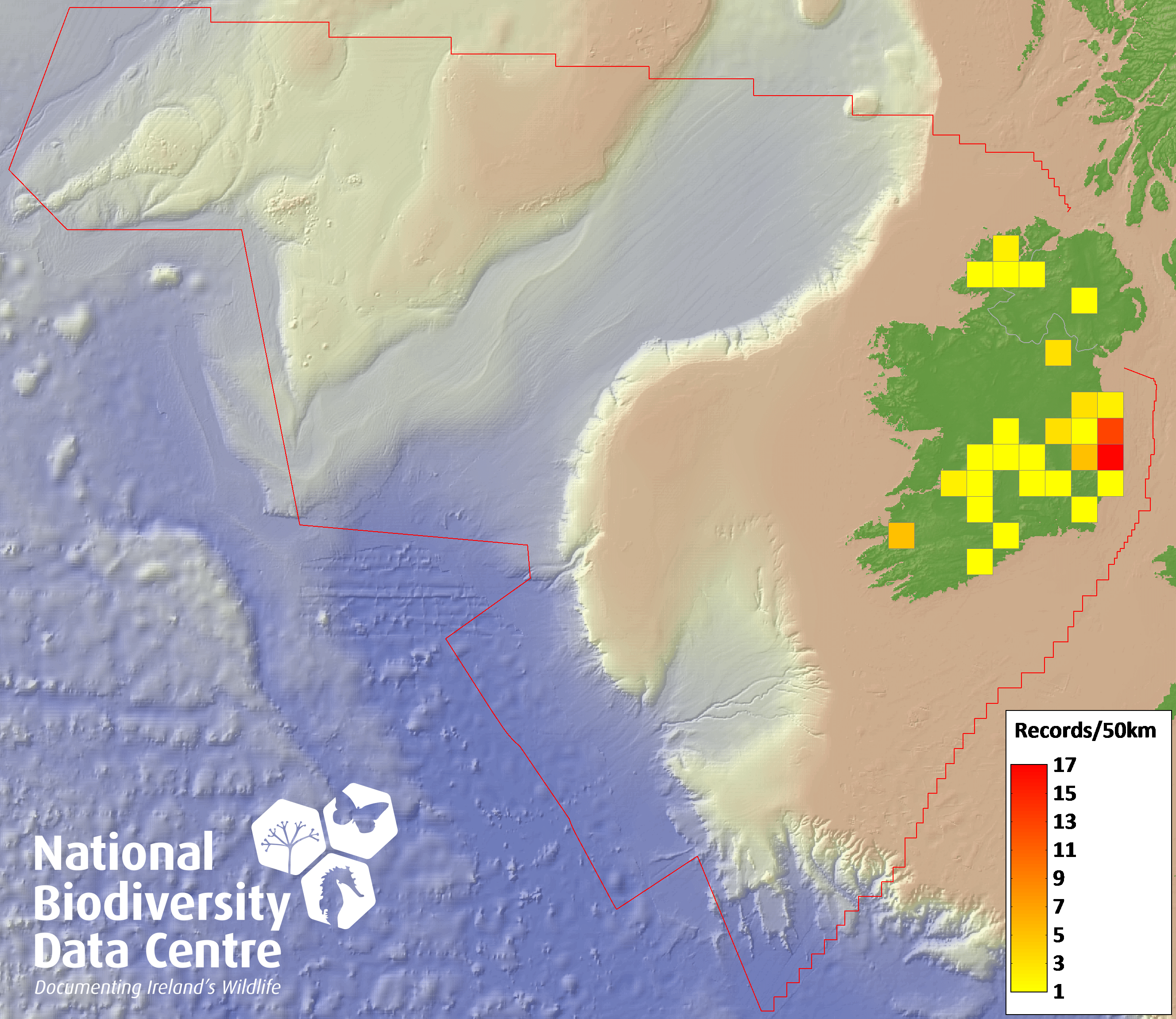 Distribution of the number of records recorded within each 10km grid square (ITM).Marine Map - 50km