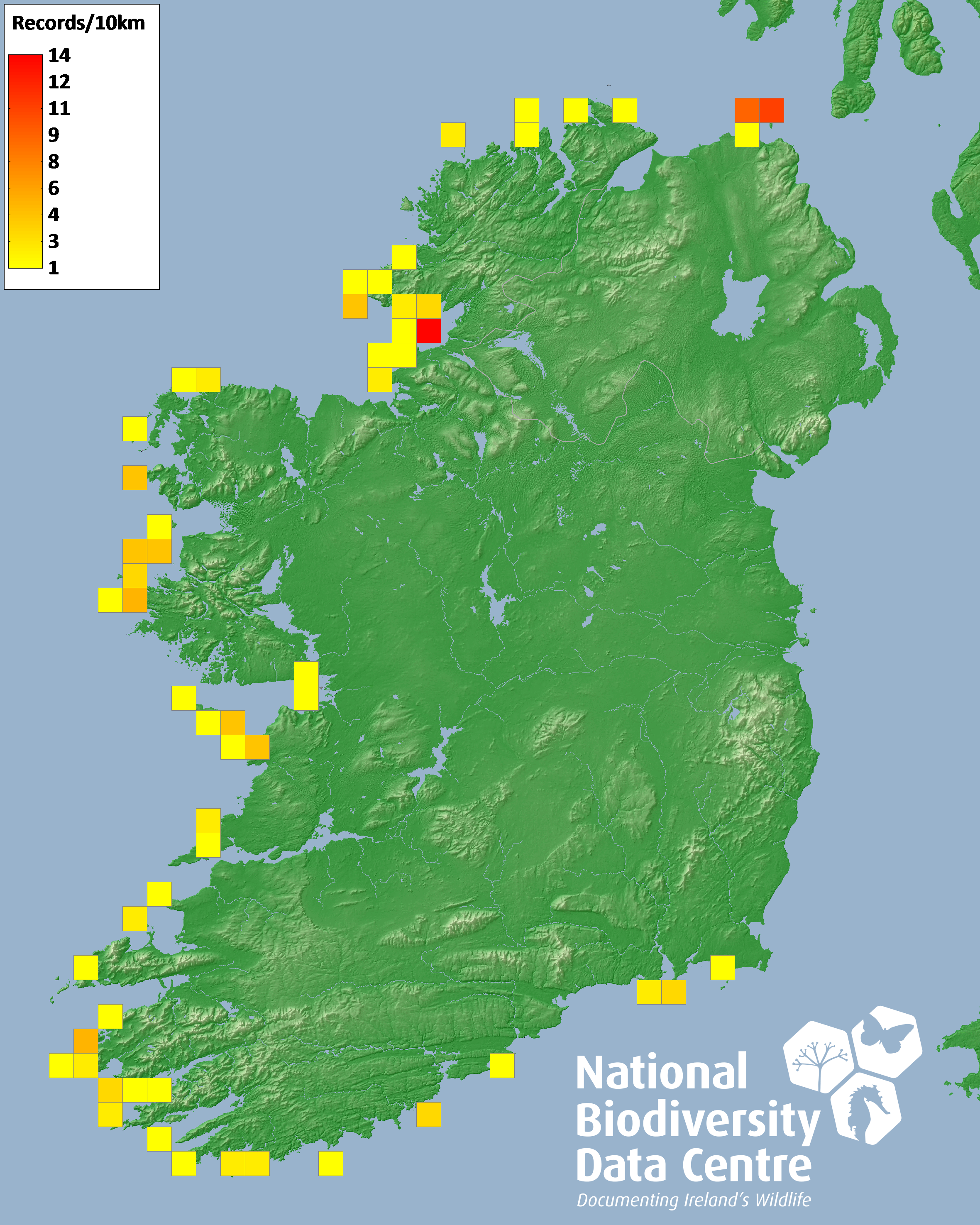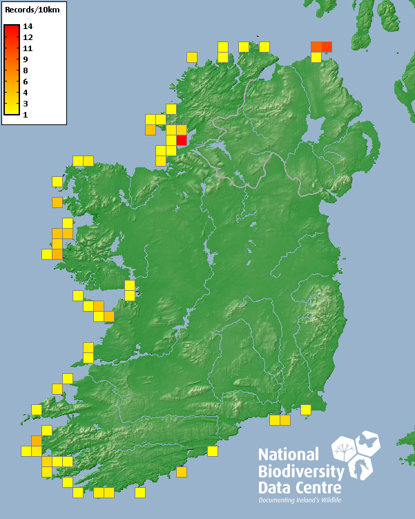 Distribution of the number of records recorded within each 10km grid square (ITM).Marine Map - 50km