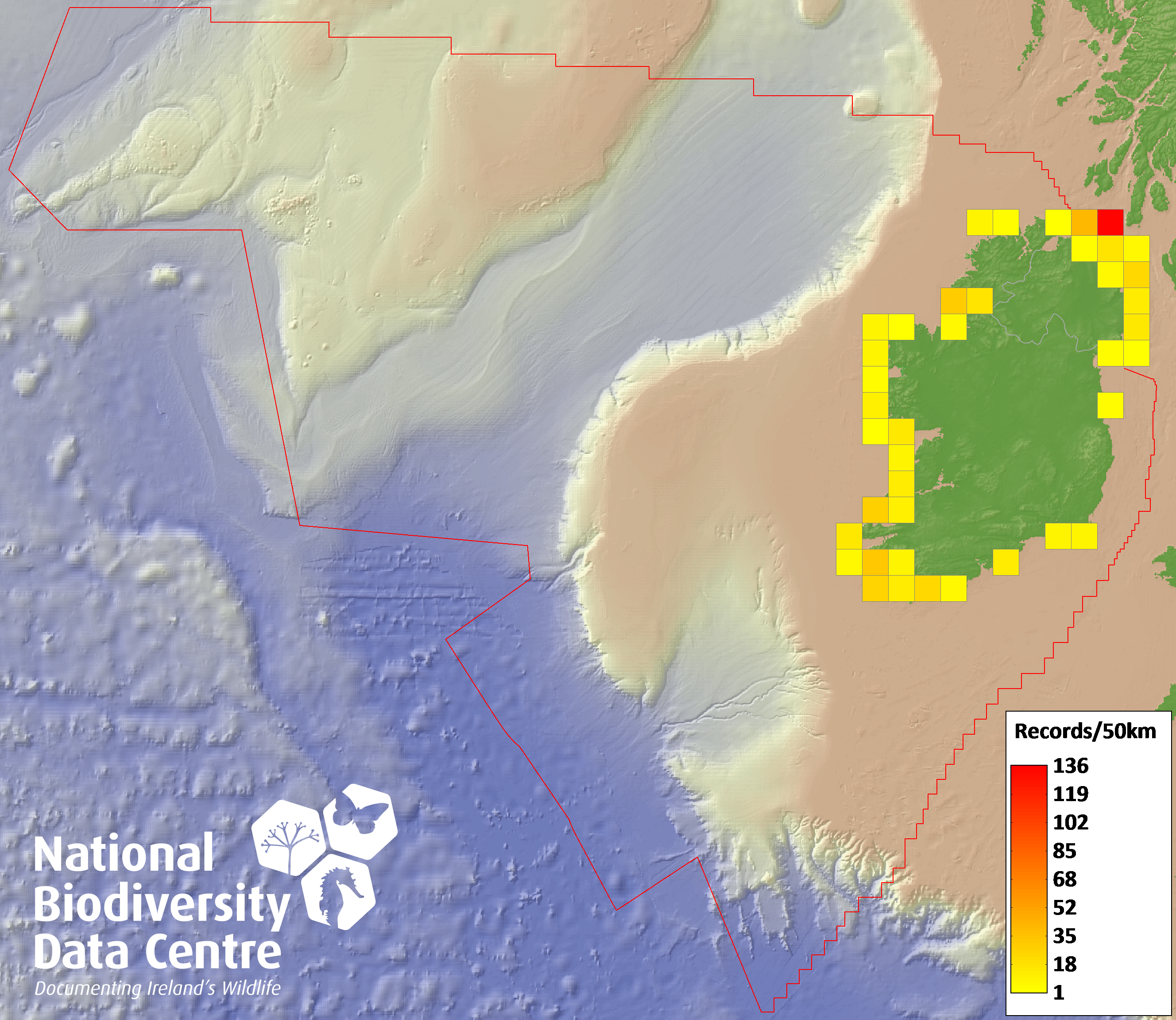 Distribution of the number of records recorded within each 10km grid square (ITM).Marine Map - 50km