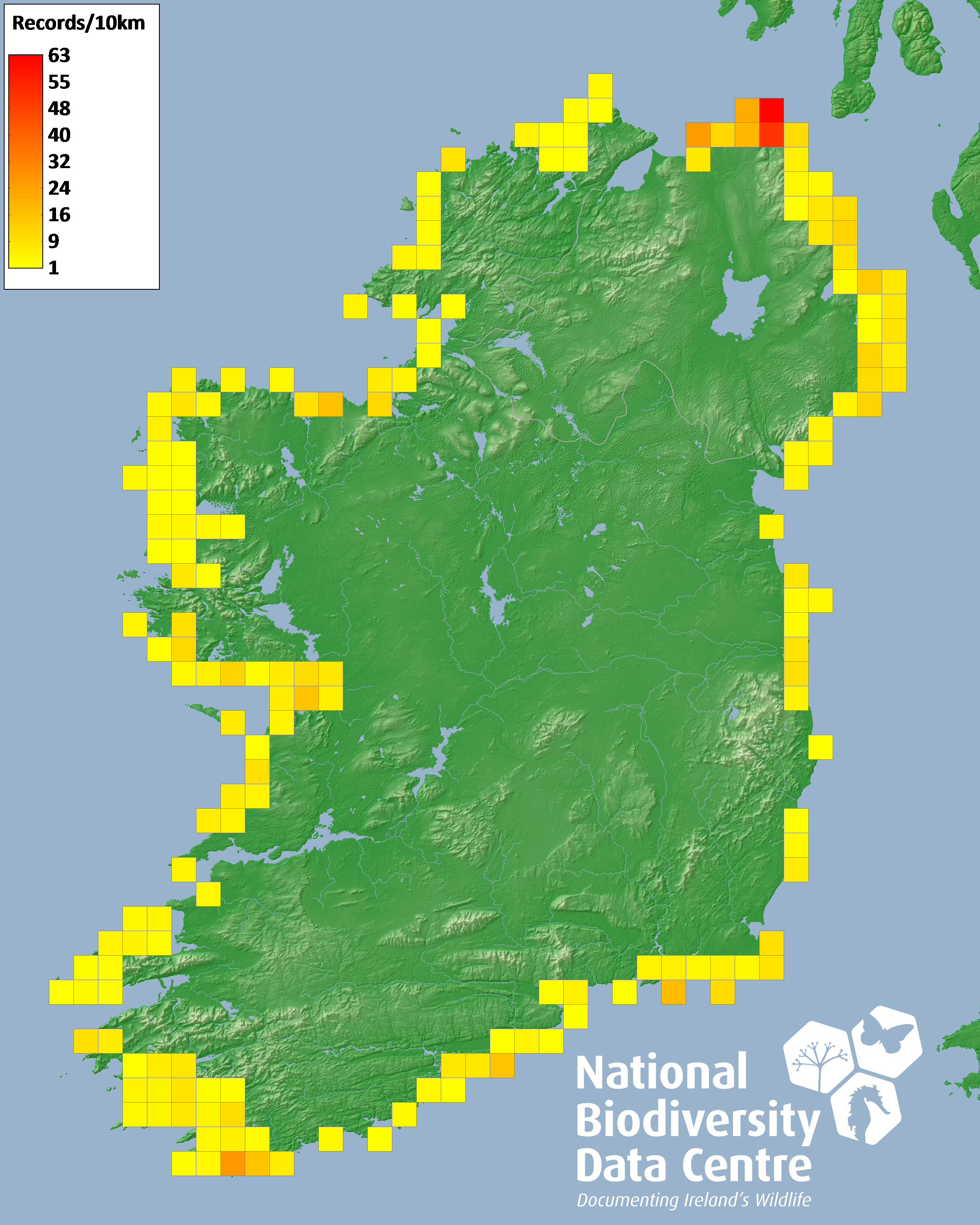 Distribution of the number of records recorded within each 10km grid square (ITM).Marine Map - 50km