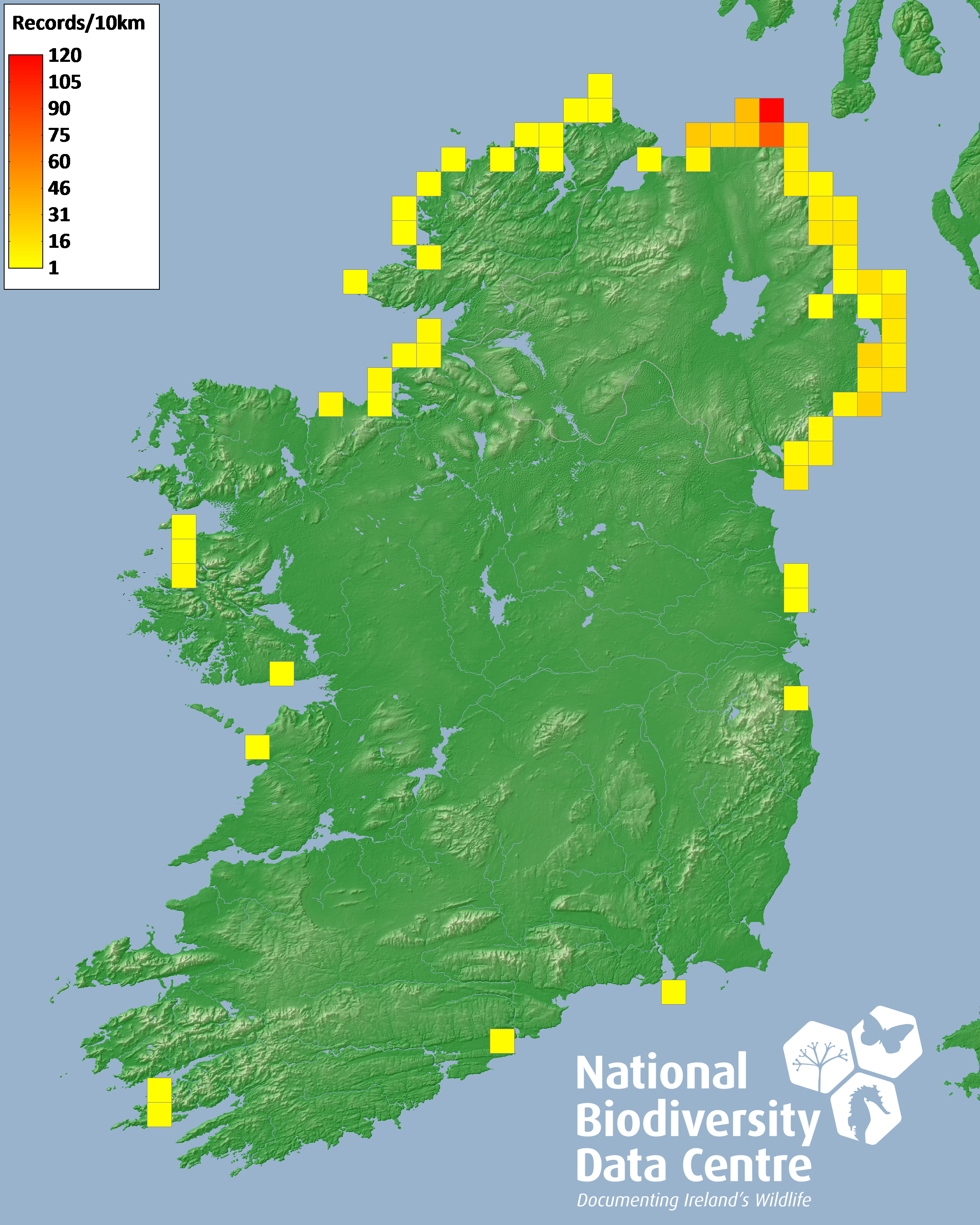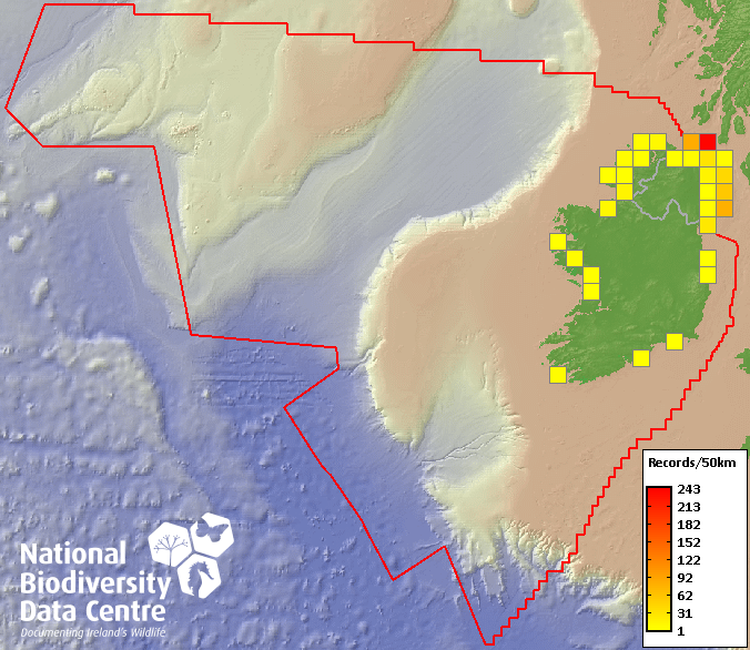 Distribution of the number of records recorded within each 10km grid square (ITM).Marine Map - 50km