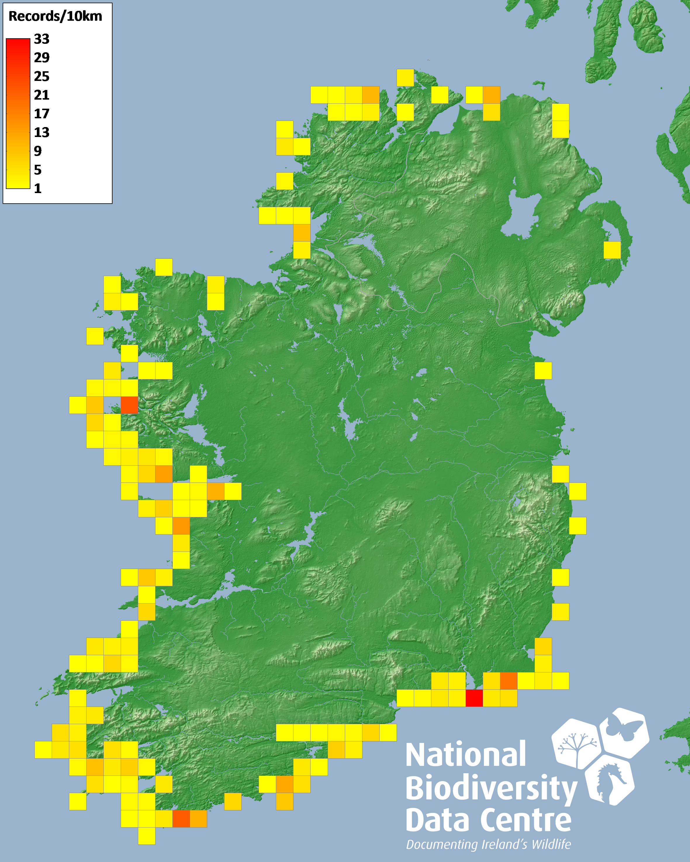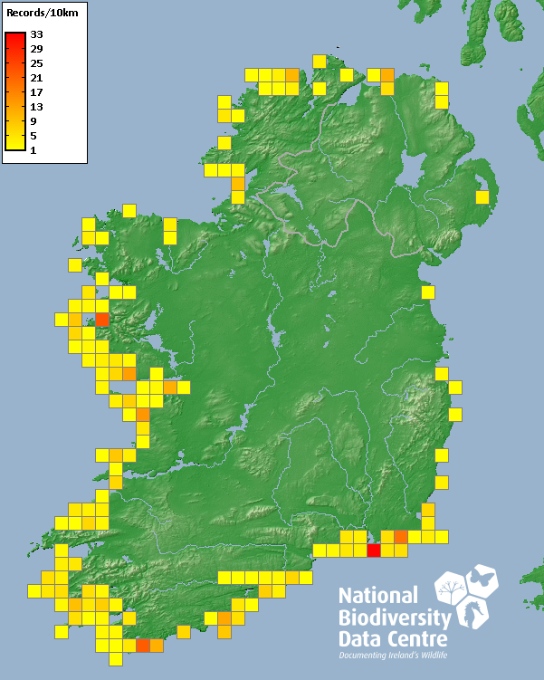 Distribution of the number of records recorded within each 10km grid square (ITM).Marine Map - 50km