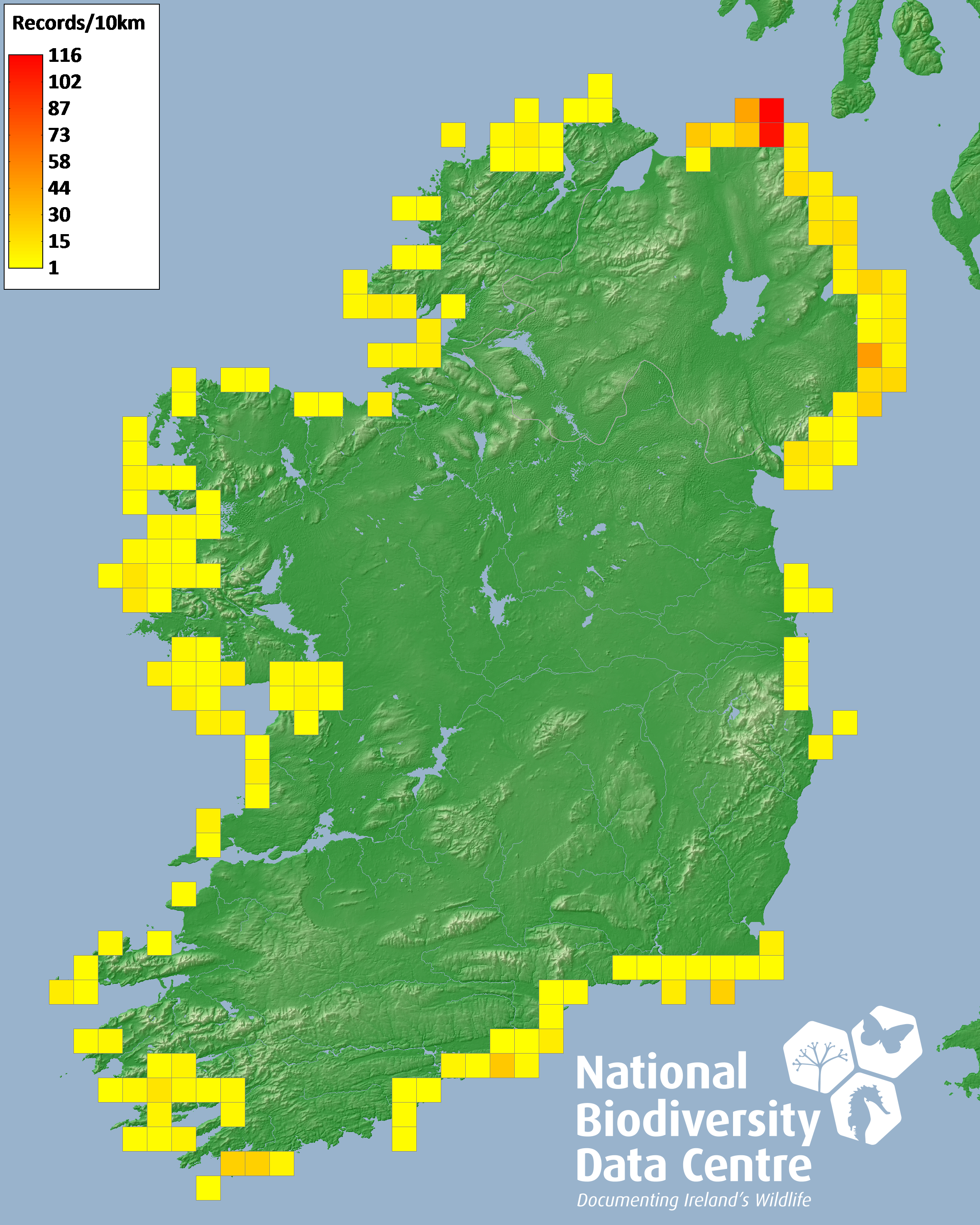 Distribution of the number of records recorded within each 10km grid square (ITM).Marine Map - 50km