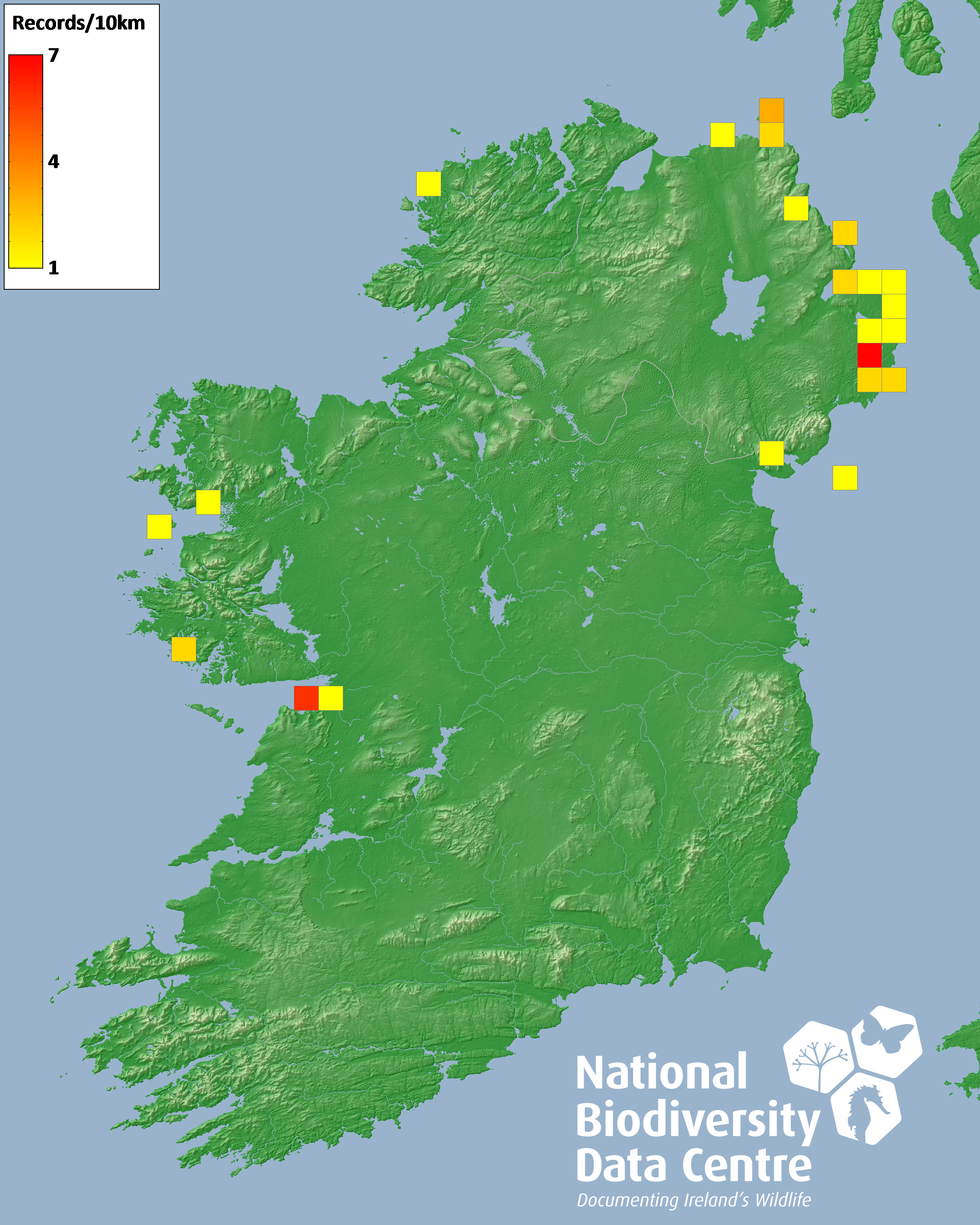 Distribution of the number of records recorded within each 10km grid square (ITM).Marine Map - 50km